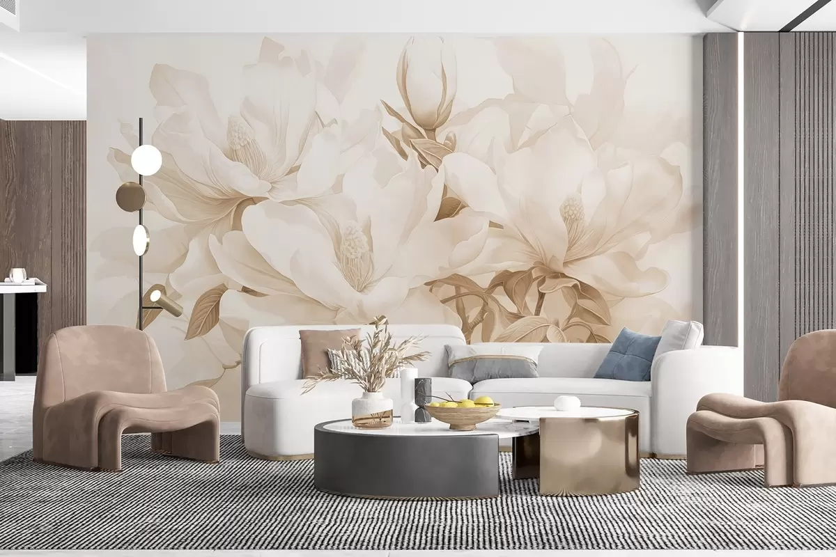 Murais de parede Flores de magnólia com pétalas brancas e bege, folhas e galhos marrons, estilo aquarela suave e delicado Nr. w08886
