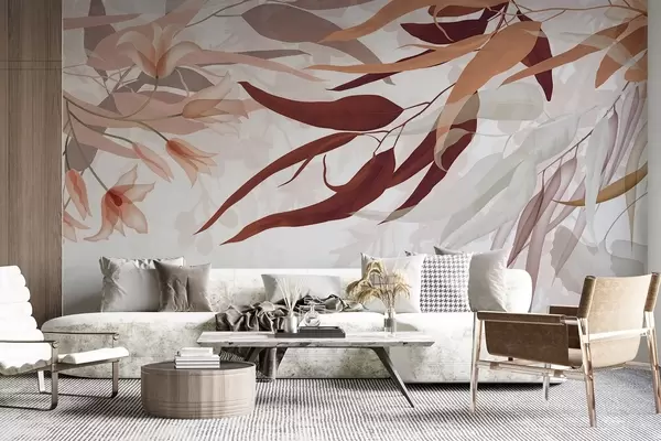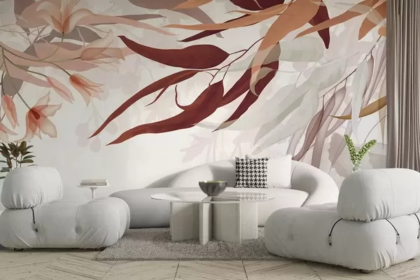 Murais de parede Folhas de eucalipto em tons de bordo, bege e branco com flores e galhos delicados em um fundo branco Nr. w08887