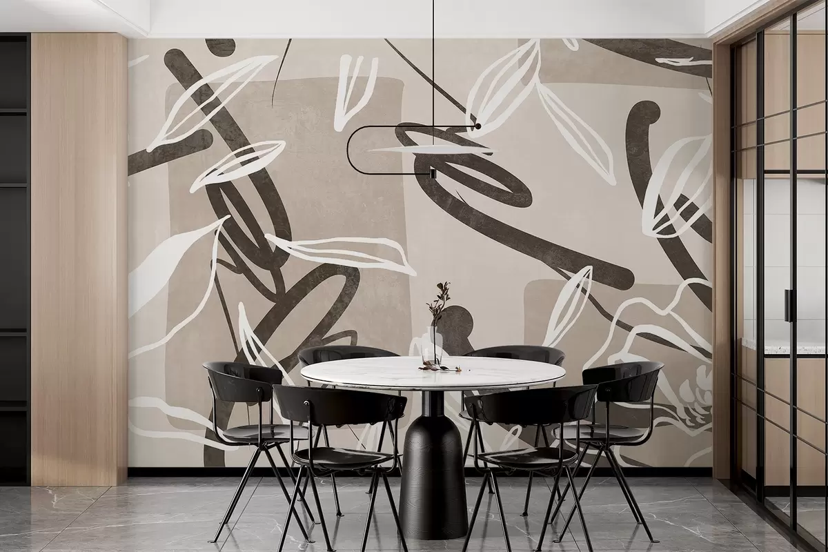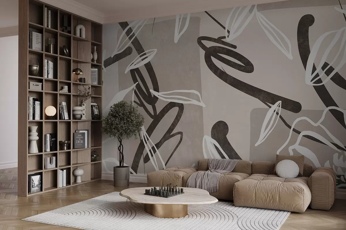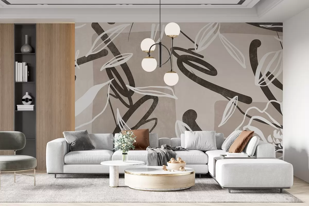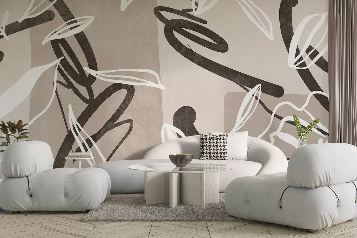 Murais de parede Design moderno e minimalista com textura abstrata e elementos florais em uma paleta de cores bege neutra Nr. w08888