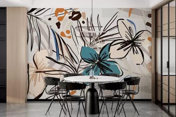 Murais de parede Impressão abstrata moderna com folhas de palmeira tropical, flores azuis e bege, linhas pretas, fundo claro Nr. w08889