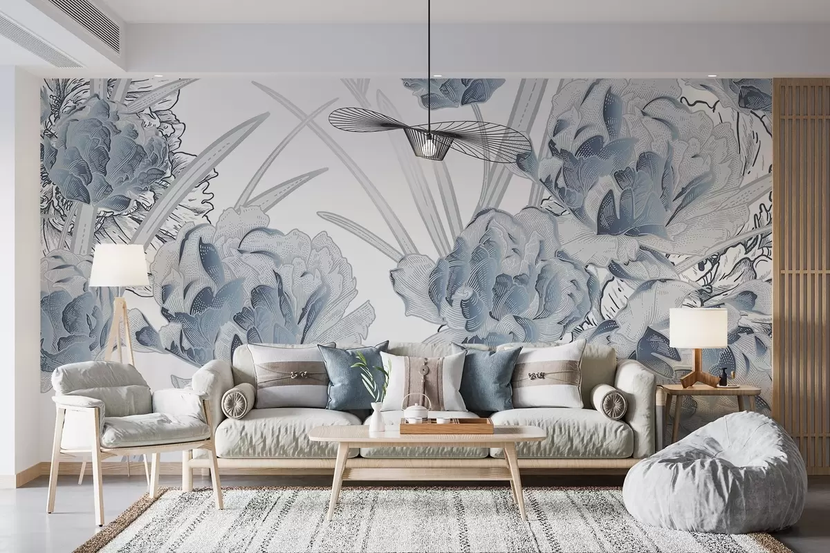 Murais de parede Peônias azuis com folhas em um fundo branco, desenho floral, ilustração botânica Nr. w08896