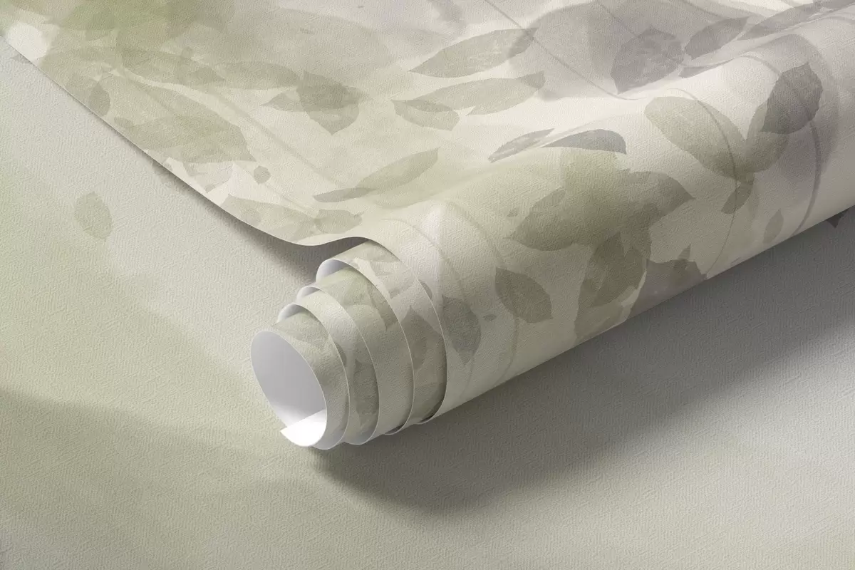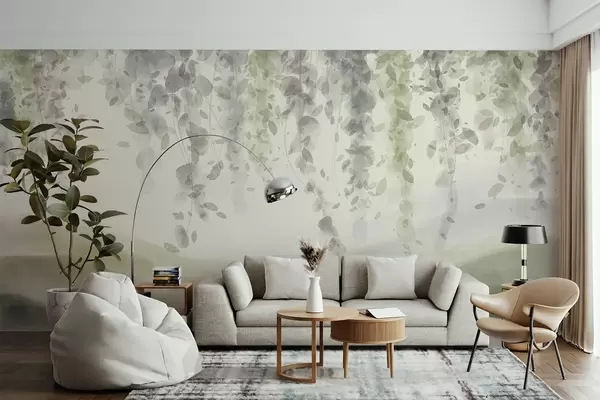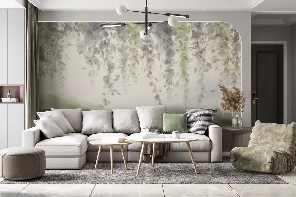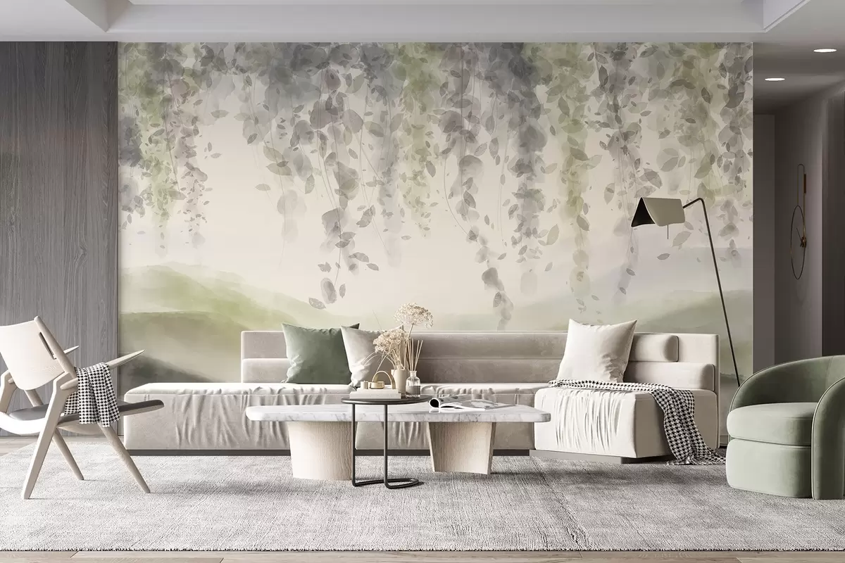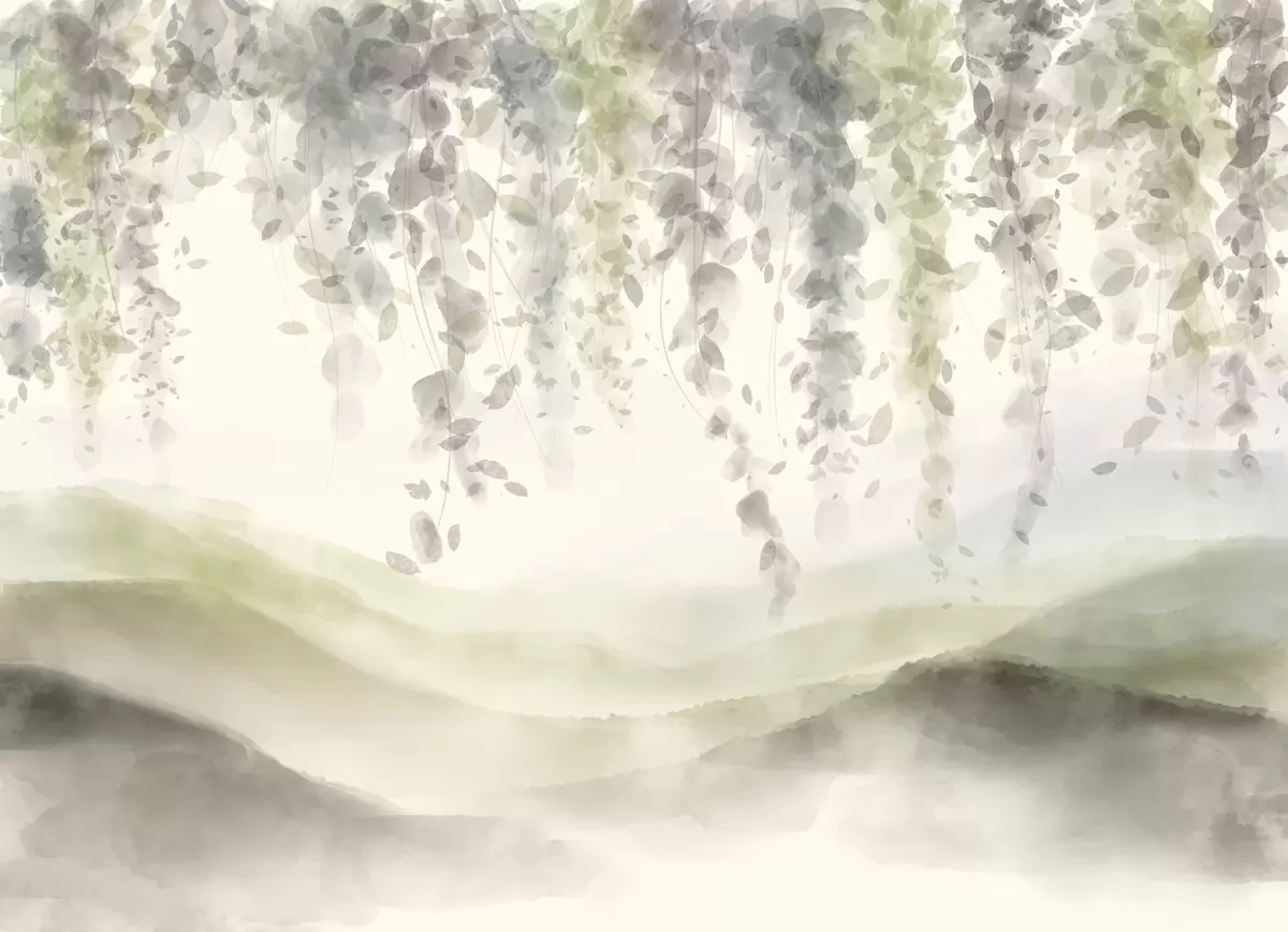 Murais de parede Folhas de glicínias penduradas sobre montanhas azuladas, cores suaves de verde pastel e bege, paisagem em estilo aquarela Nr. w08909v2