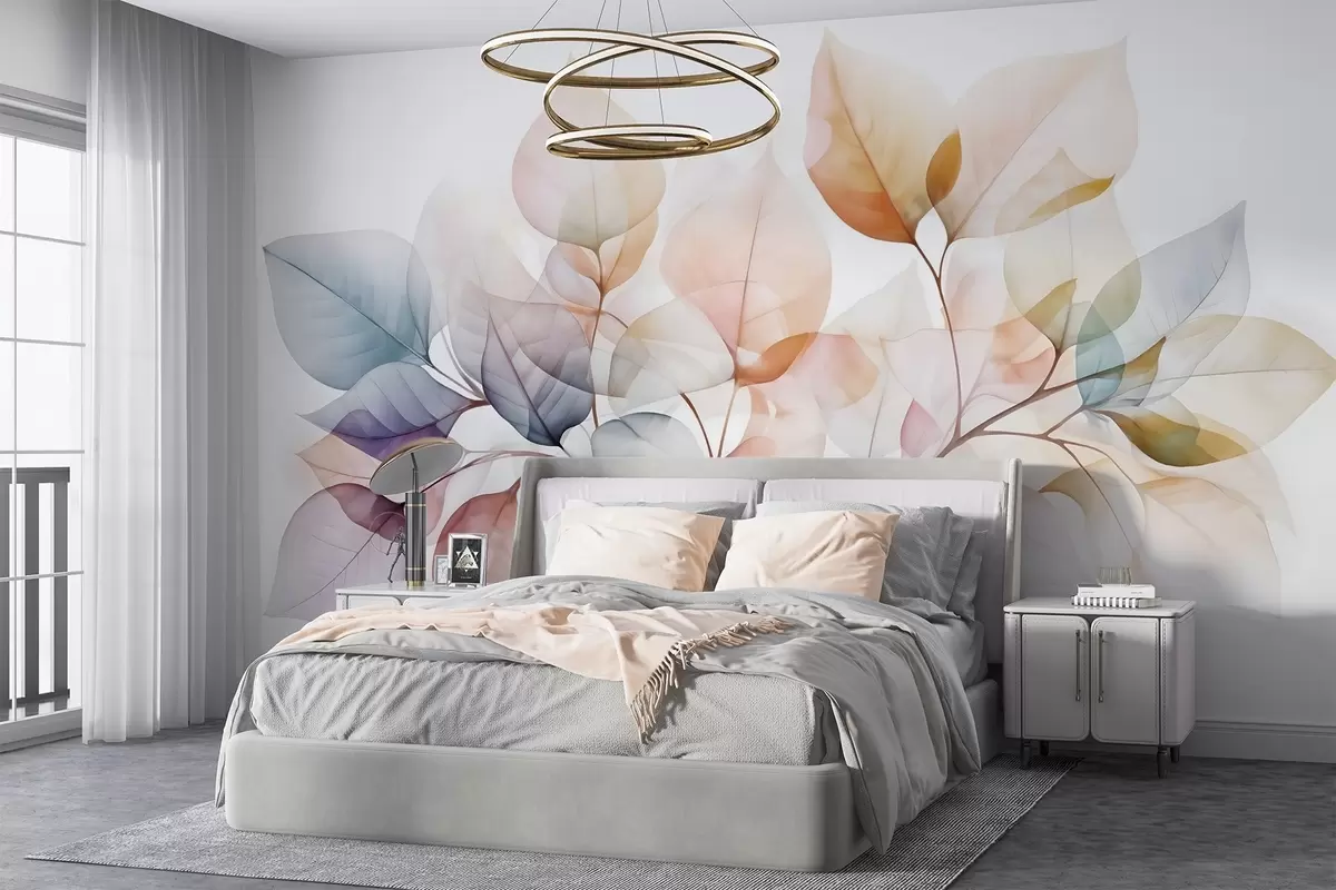 Murais de parede Pintura em aquarela de folhas translúcidas em cores pastéis, com tons de rosa, branco, roxo e azul Nr. w08910