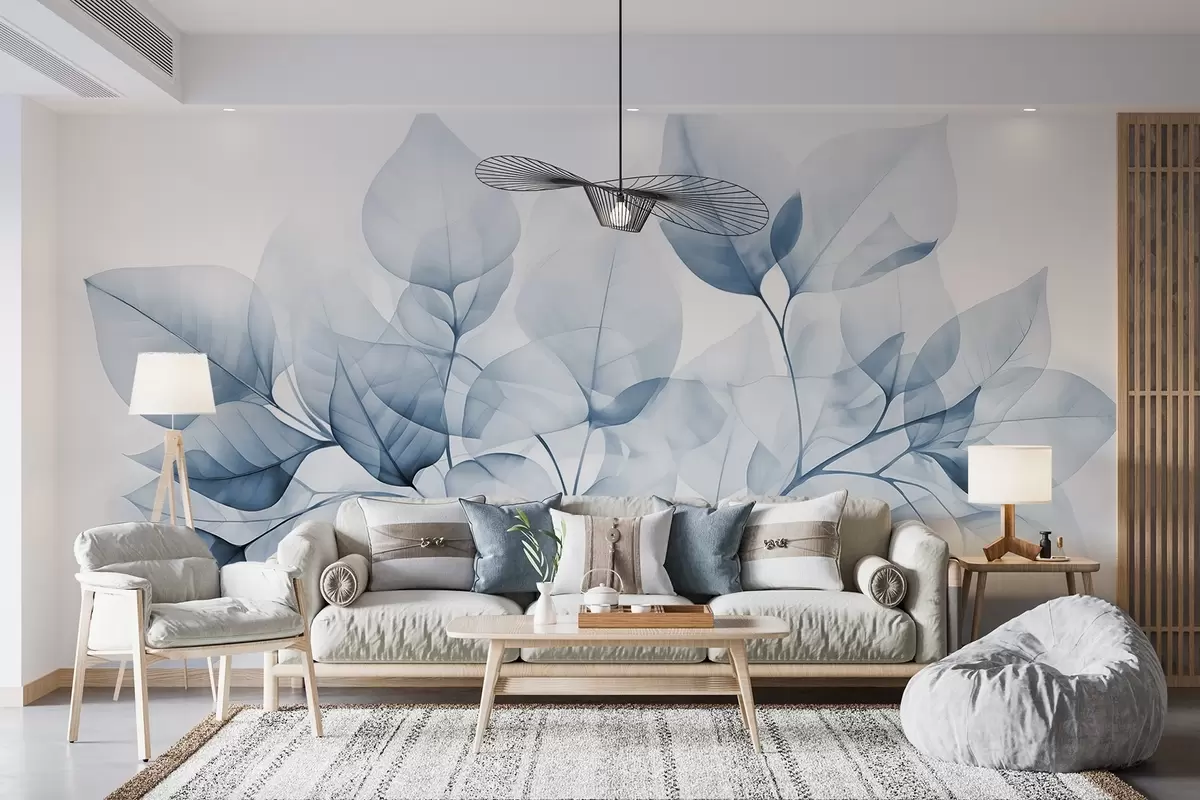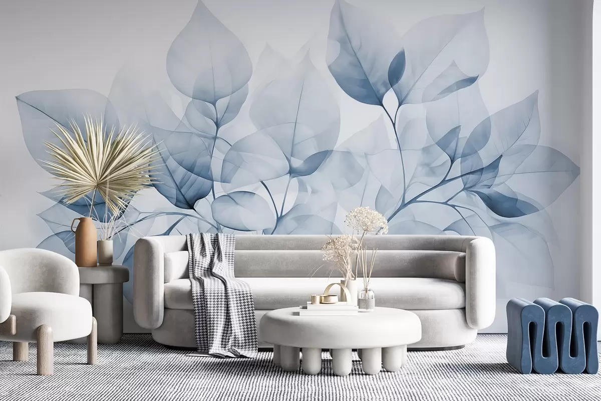 Murais de parede Pintura em aquarela de folhas translúcidas em cores pastéis, com tons de branco e azul Nr. w08910v1