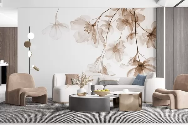 Murais de parede Flores bege com pétalas translúcidas penduradas em um galho, bege e branco, composição de arte moderna minimalista Nr. w08911v1