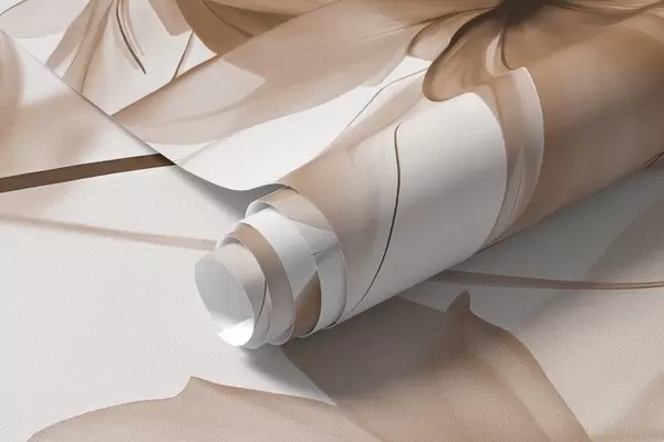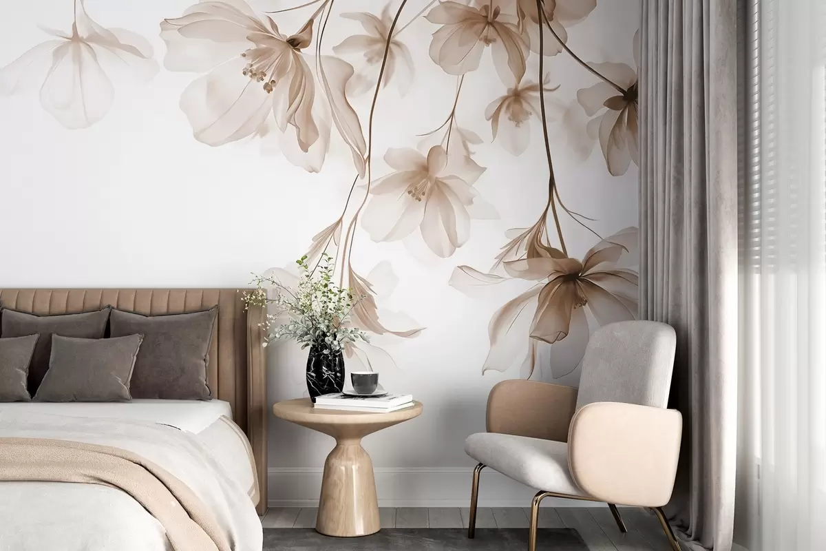 Murais de parede Flores bege com pétalas translúcidas penduradas em um galho, bege e branco, composição de arte moderna minimalista Nr. w08911v1