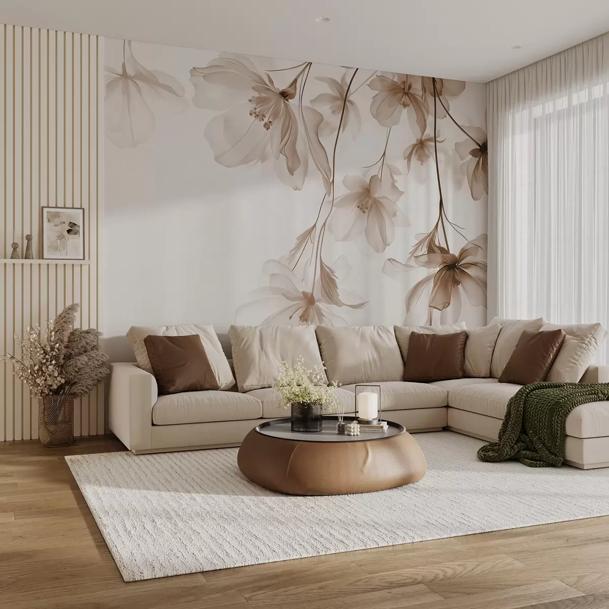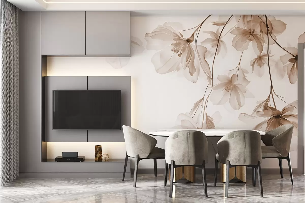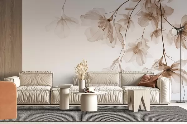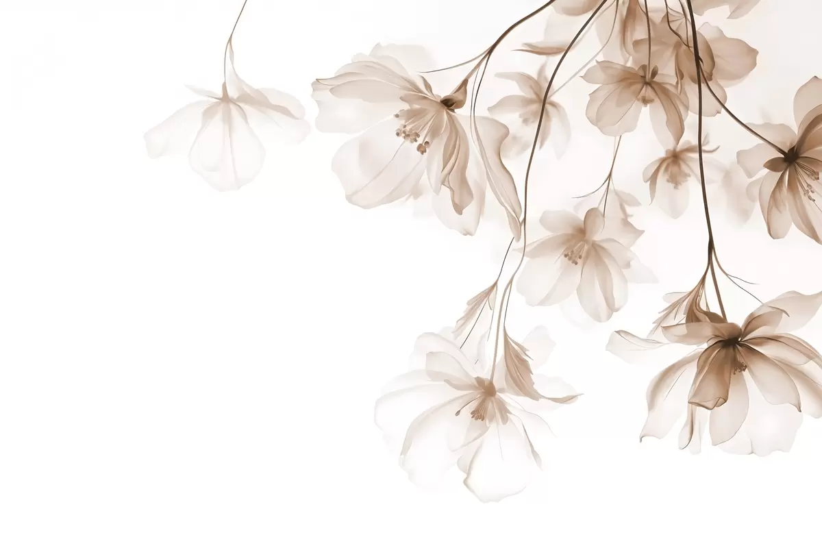 Murais de parede Flores bege com pétalas translúcidas penduradas em um galho, bege e branco, composição de arte moderna minimalista Nr. w08911v1