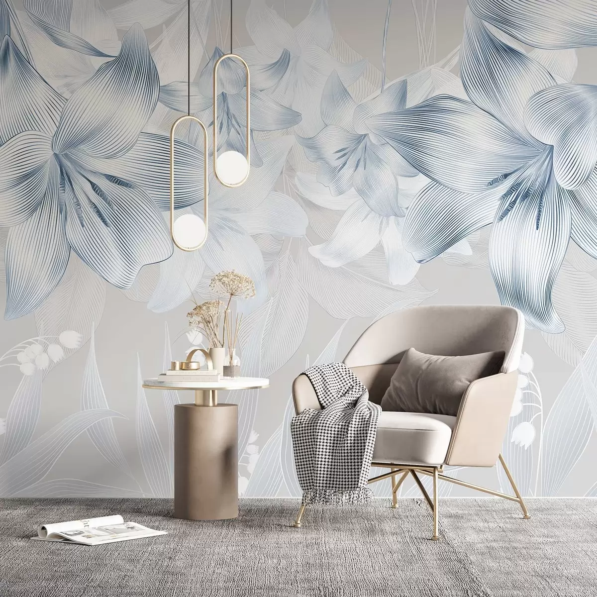 Murais de parede Lírios azuis com detalhes de linhas complexas, arranjo floral elegante, paleta de cores neutras Nr. w08912v1