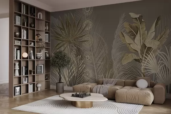 Murais de parede Folhas tropicais em tons de bege e marrom, folhas de palmeira, folhas de bananeira e ornamentos de mandala, fundo escuro Nr. w08913v1