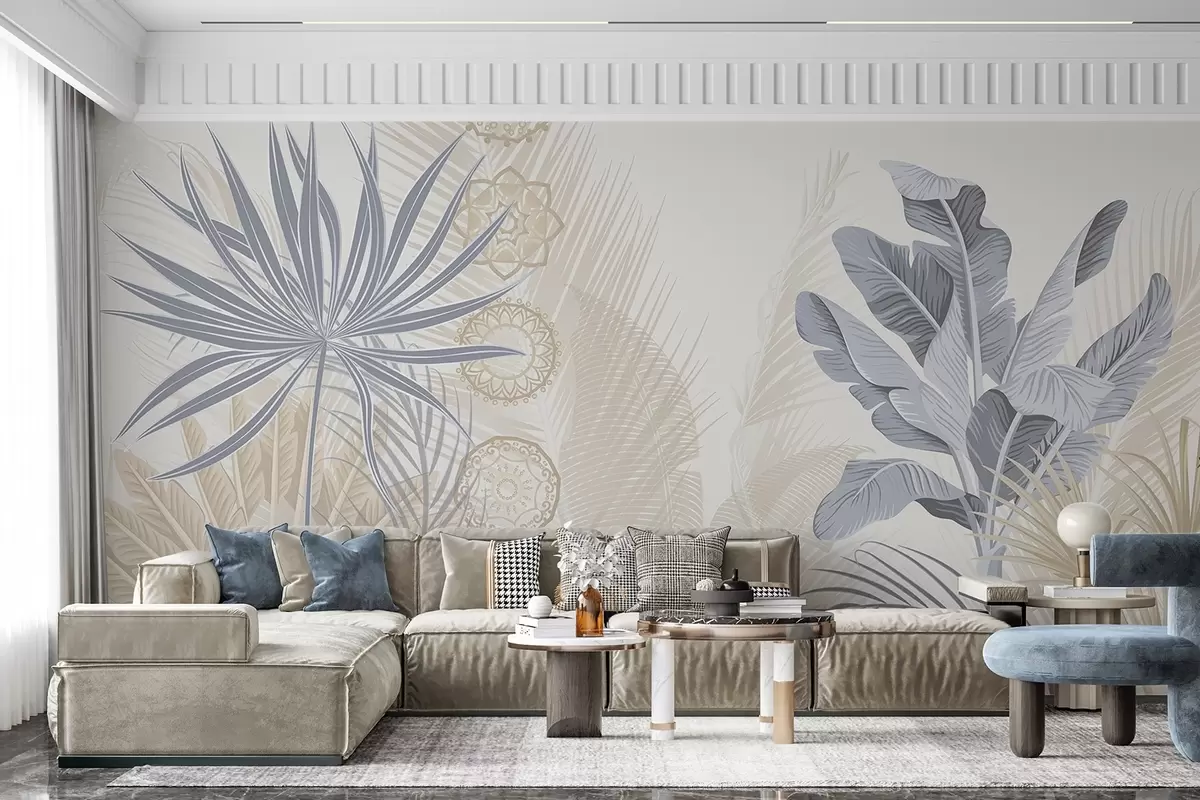 murais de parede Folhas tropicais em tons de azul e bege, folhas de palmeira, folhas de bananeira e ornamentos de mandala, fundo claro w08913v2