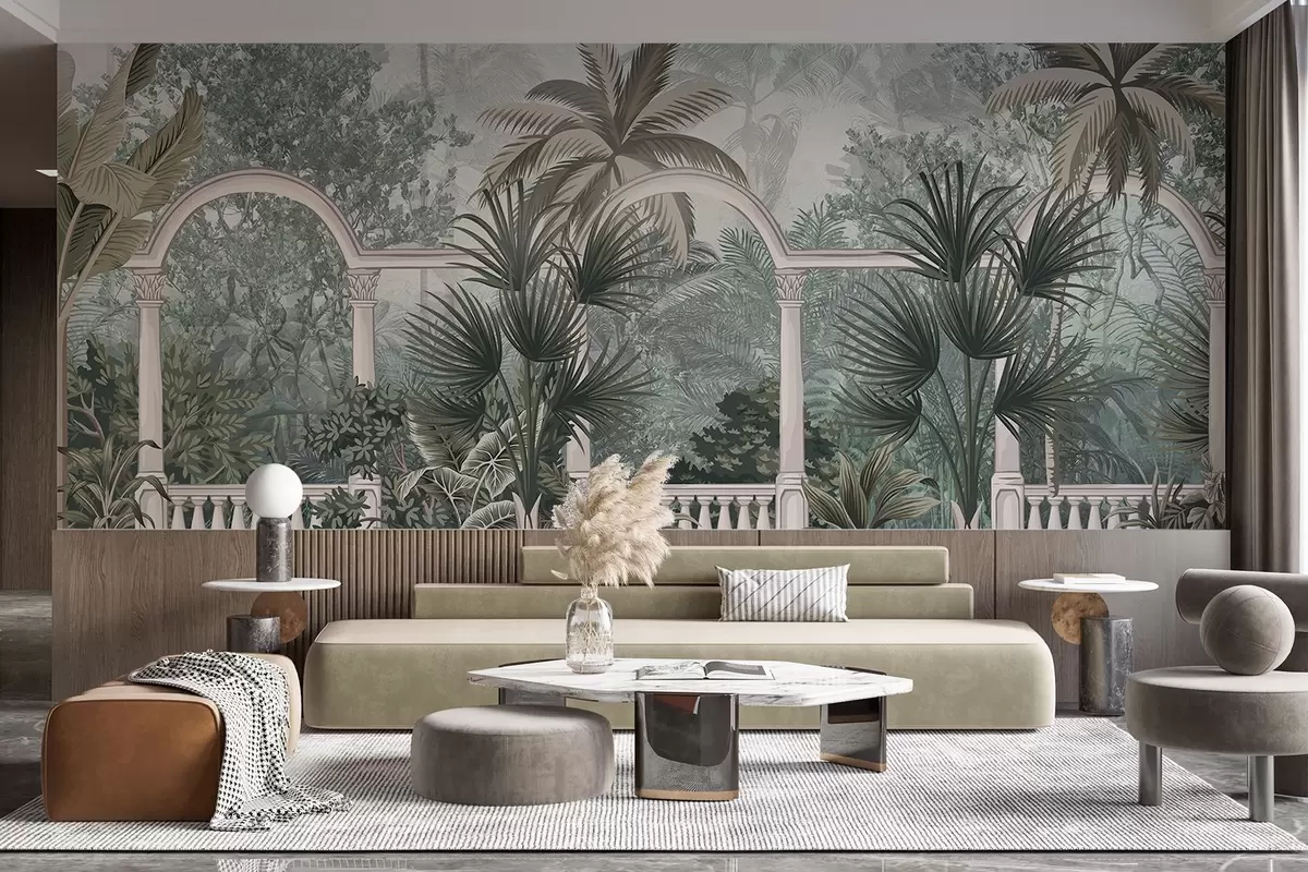 Murais de parede Jardim tropical texturizado com palmeiras e vegetação exuberante, balaustrada com arcos, cores suaves, estilo vintage Nr. w08916