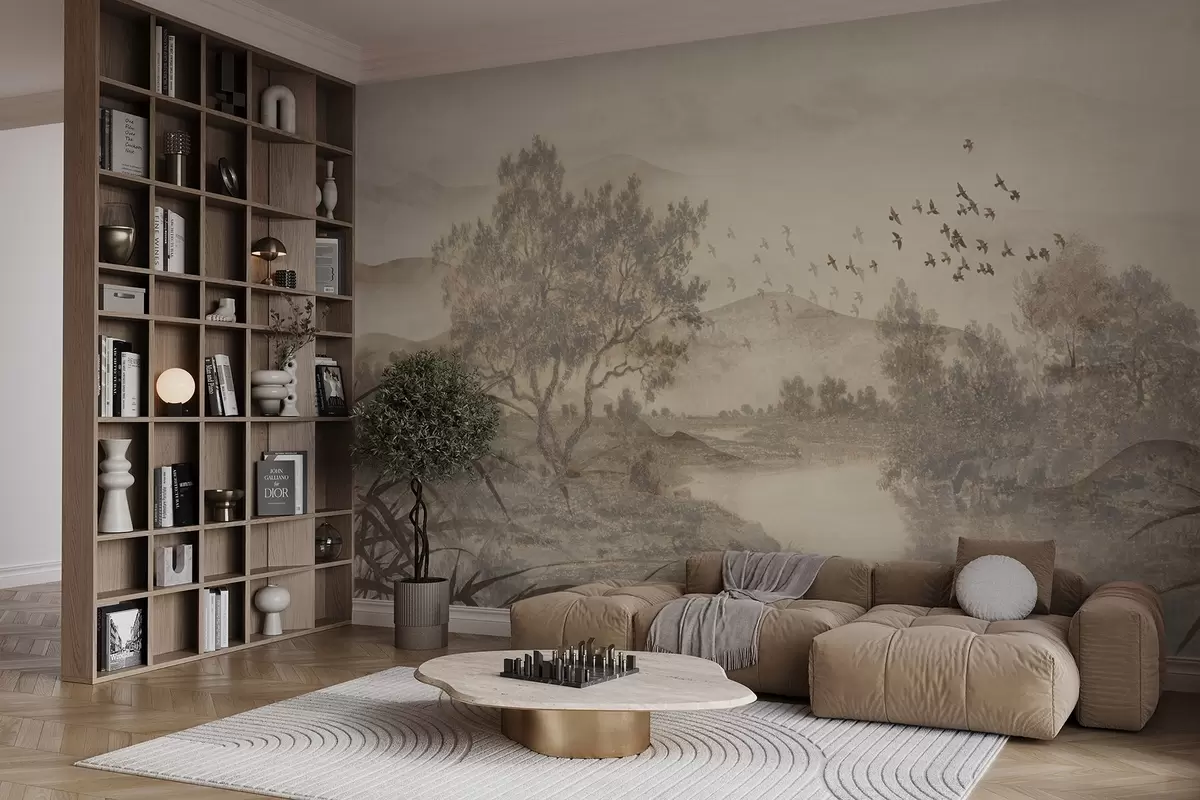 Murais de parede Paisagem vintage texturizada com uma árvore perto de um rio e um céu nublado, arte da natureza em tons de sépia Nr. w08920