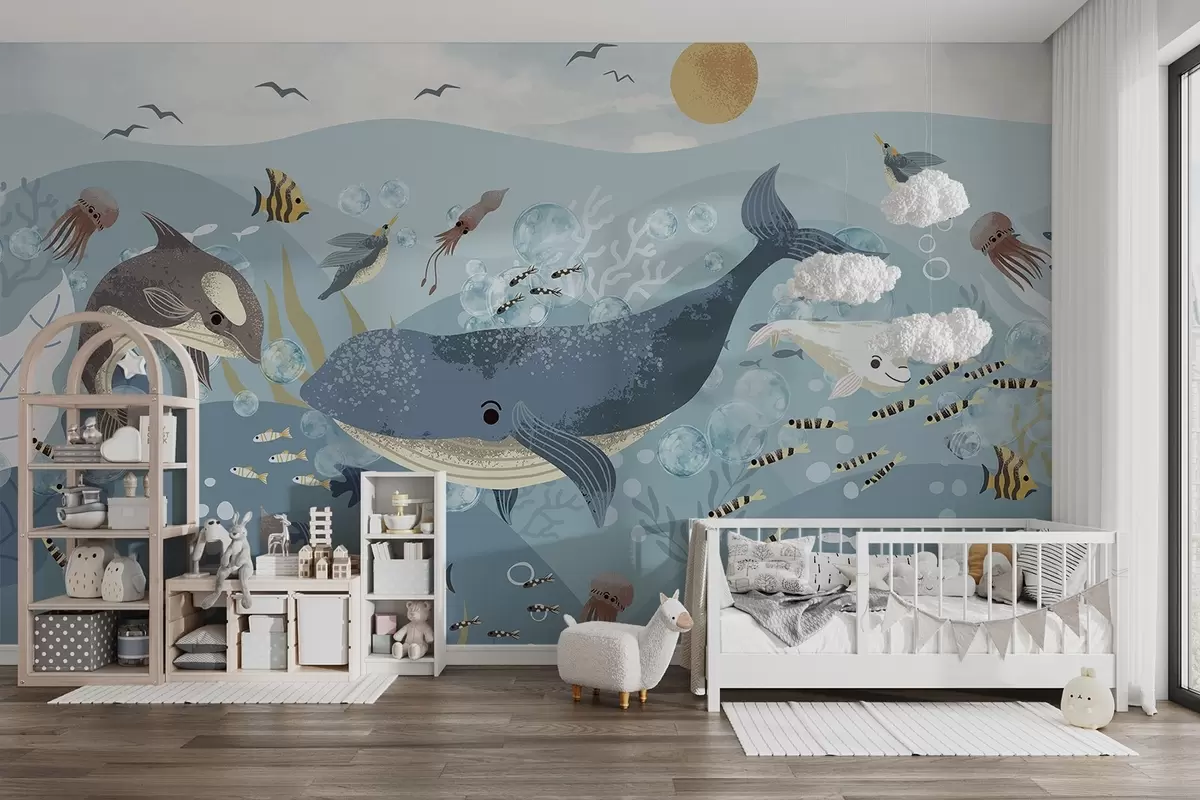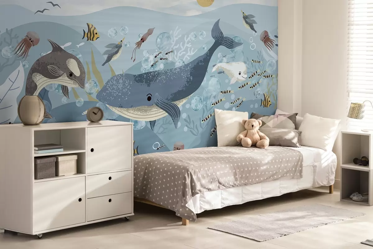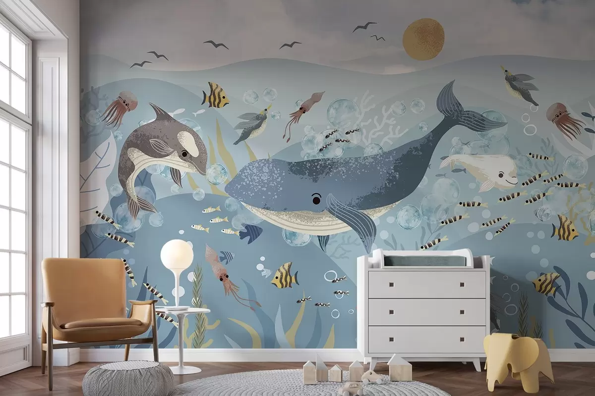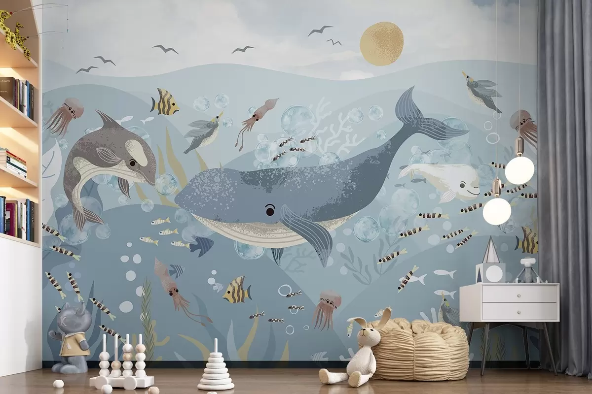 Murais de parede Ilustração infantil com estampa fofa de baleia azul cercada por peixes, lulas e águas-vivas em um oceano azul com bolhas Nr. w08921