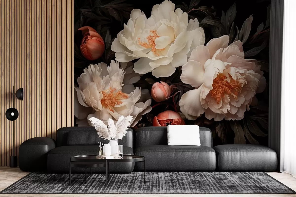 Murais de parede Peônias grandes brancas com botões vermelhos em um fundo escuro Nr. w08965