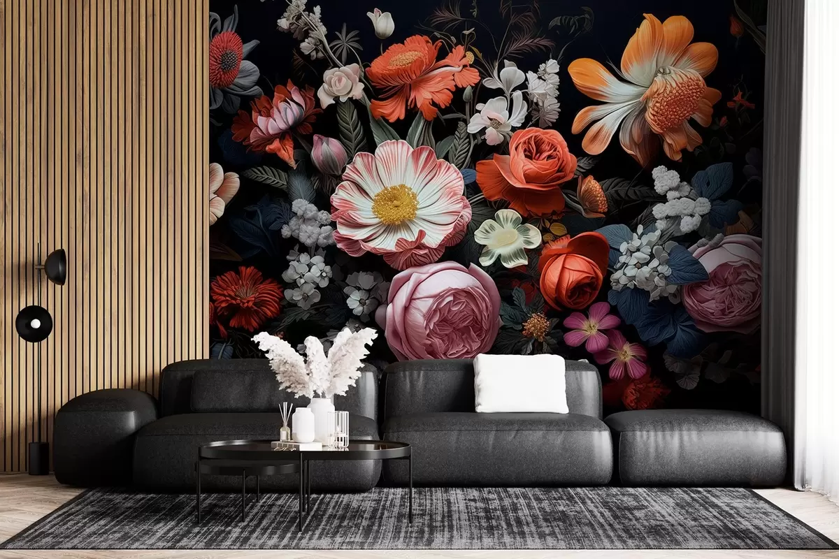 Murais de parede Buquê colorido de várias flores em um fundo escuro em tons frios Nr. w08969v1