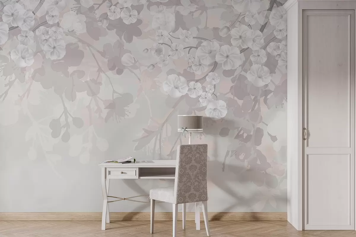 Murais de parede Ramos de cerejeira com flores brancas e folhas cinzas, em elegantes silhuetas florais em tons pastéis suaves Nr. w08973v1