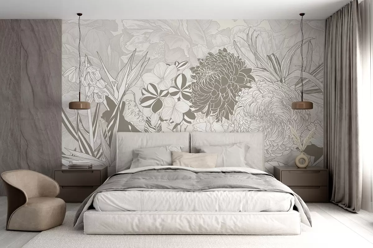Murais de parede Flores e folhas em tons de bege, incluindo crisântemos, plumeria e folhagem tropical, desenho botânico Nr. w08976