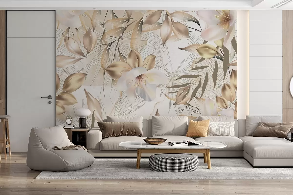 Murais de parede Flores e folhas de jasmim, cores suaves, ilustração botânica, fundo floral, design elegante, pétalas delicadas Nr. w08977