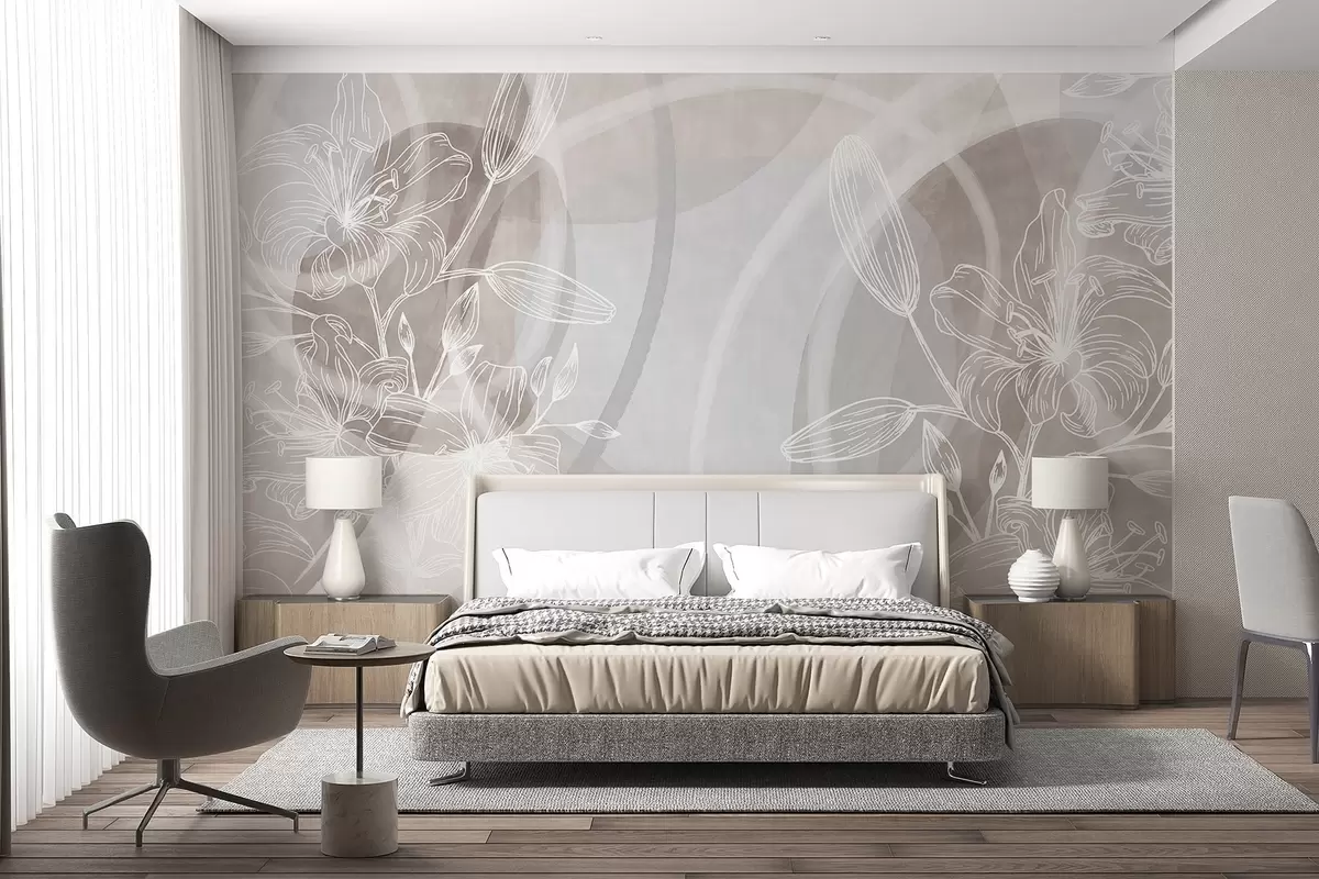 Murais de parede Design floral minimalista com flores e folhas brancas de arte linear, círculos abstratos sobrepostos em tons de bege e azul Nr. w08979v1