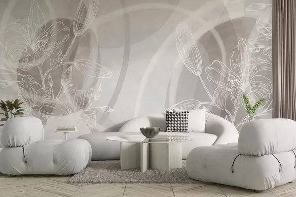 Murais de parede Design floral minimalista com flores e folhas brancas de arte linear, círculos abstratos sobrepostos em tons de bege e azul Nr. w08979v1