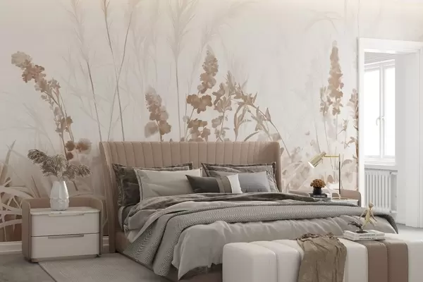 Murais de parede Flores marrons e juncos bege em um campo, textura de pintura minimalista, fundo claro, cores suaves, pinceladas delicadas Nr. w08982v1
