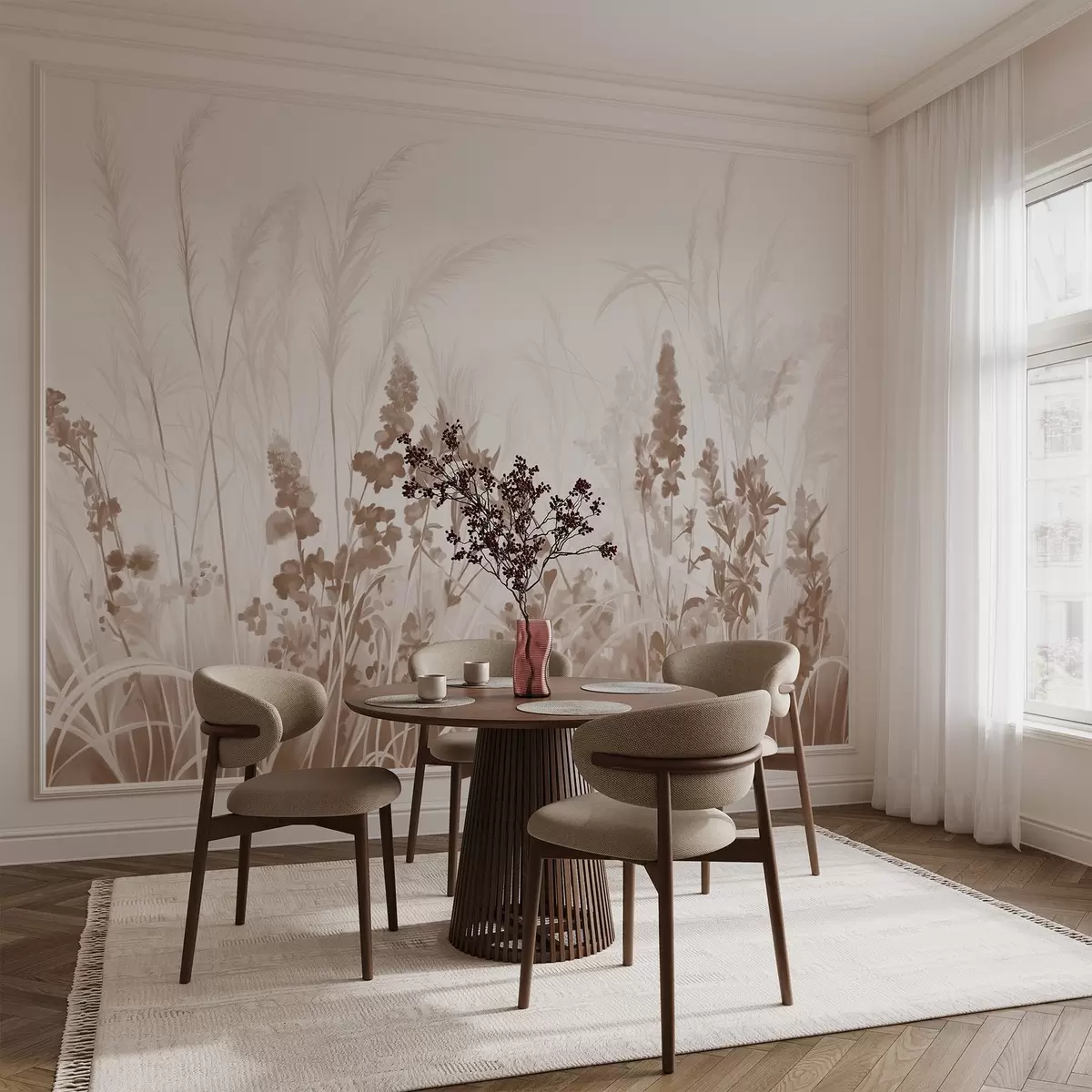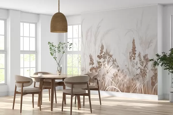 Murais de parede Flores marrons e juncos bege em um campo, textura de pintura minimalista, fundo claro, cores suaves, pinceladas delicadas Nr. w08982v1