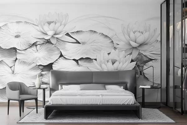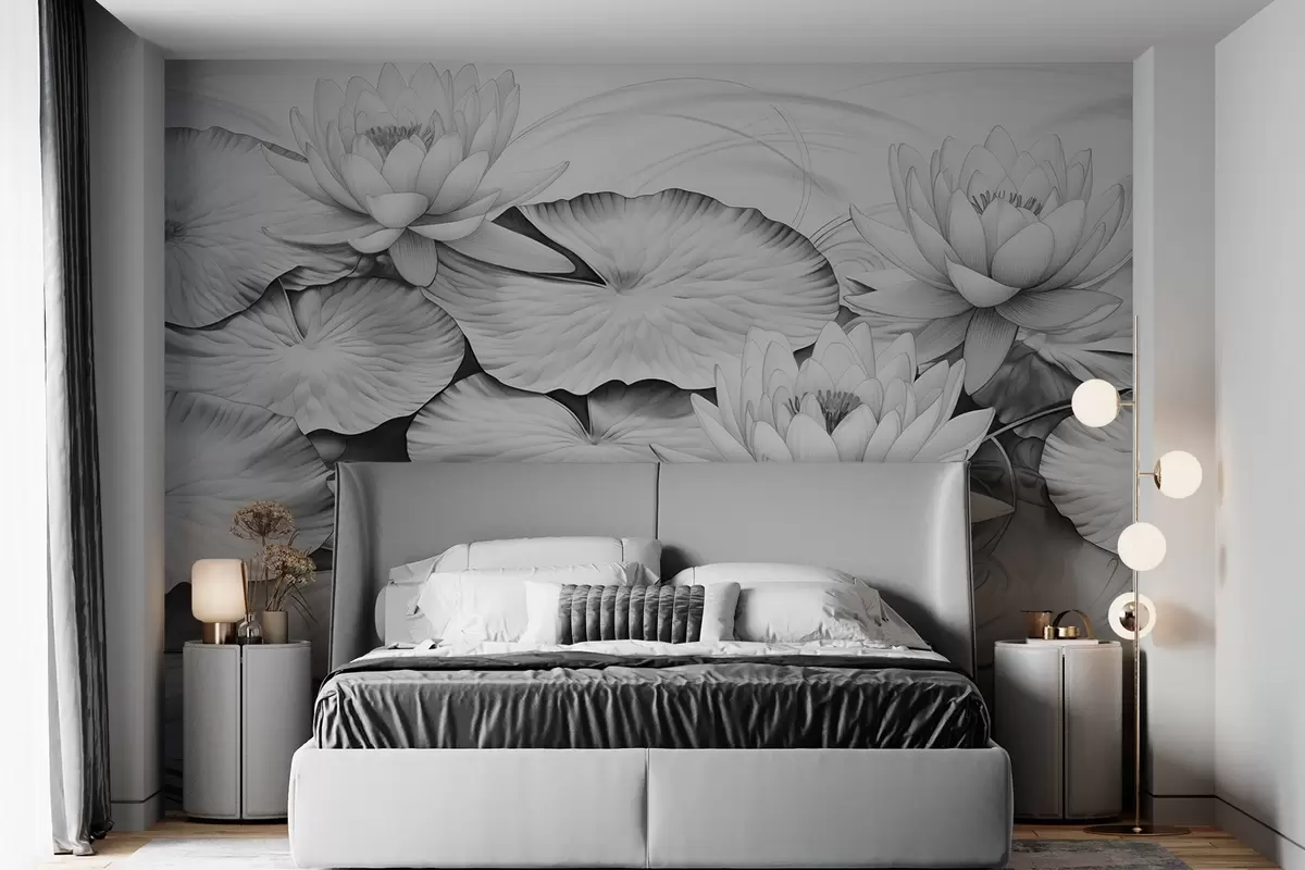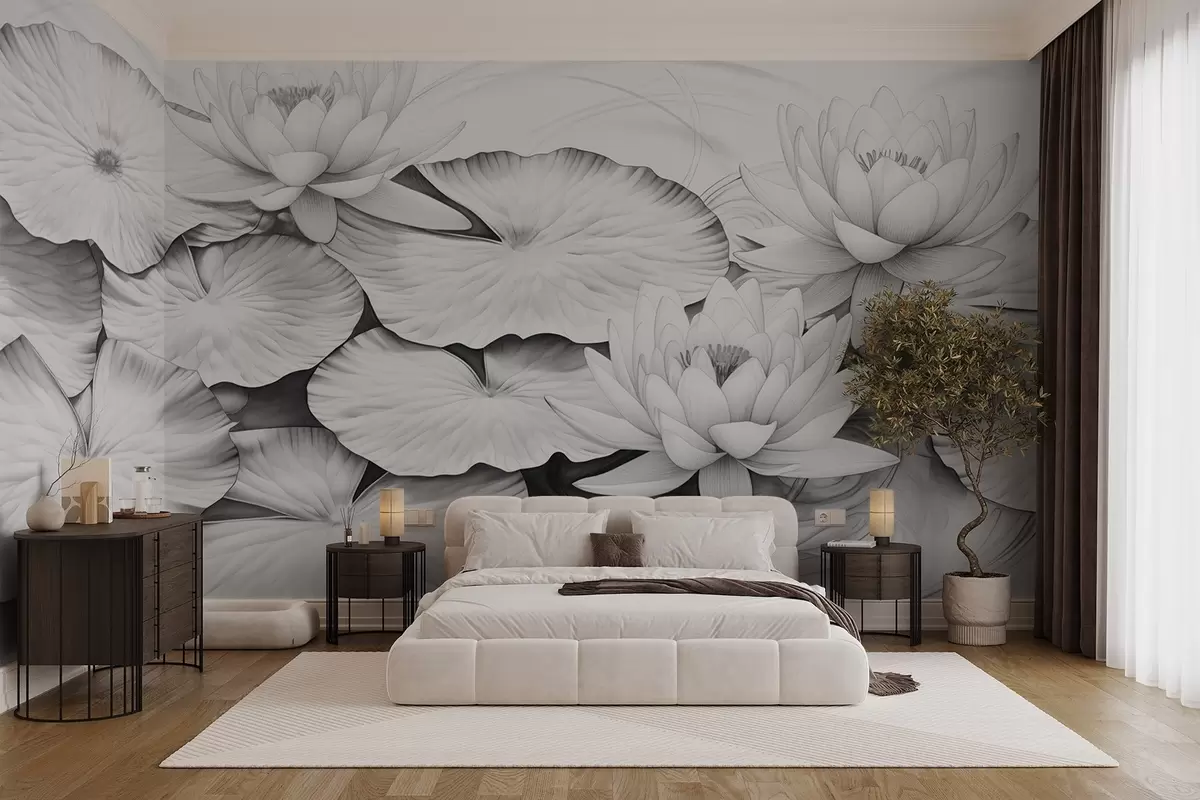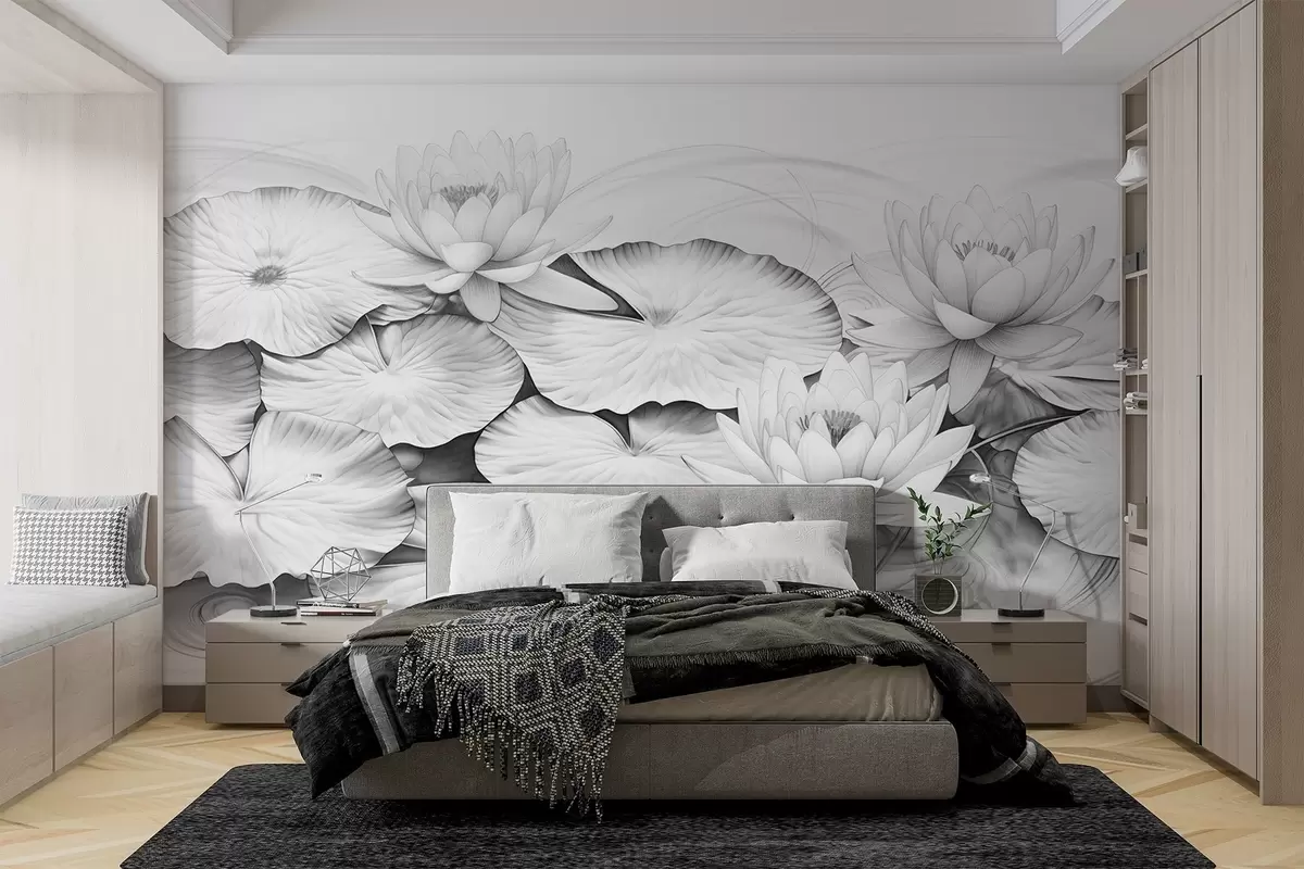 Murais de parede Nenúfares e nenúfares em um lago, imitação em preto e branco de um desenho a lápis, ilustração botânica detalhada, arte da natureza Nr. w09006