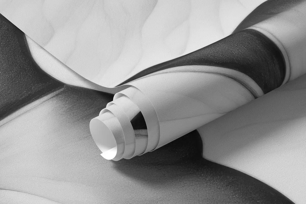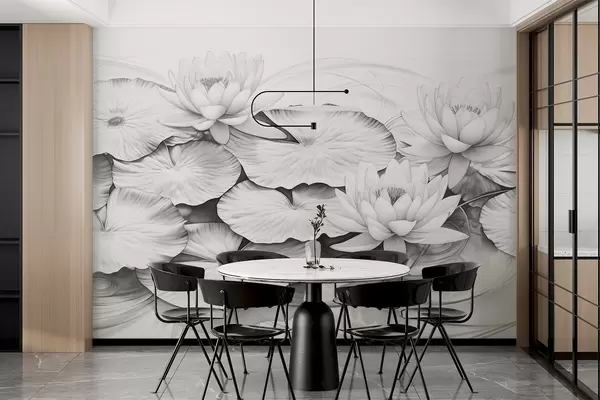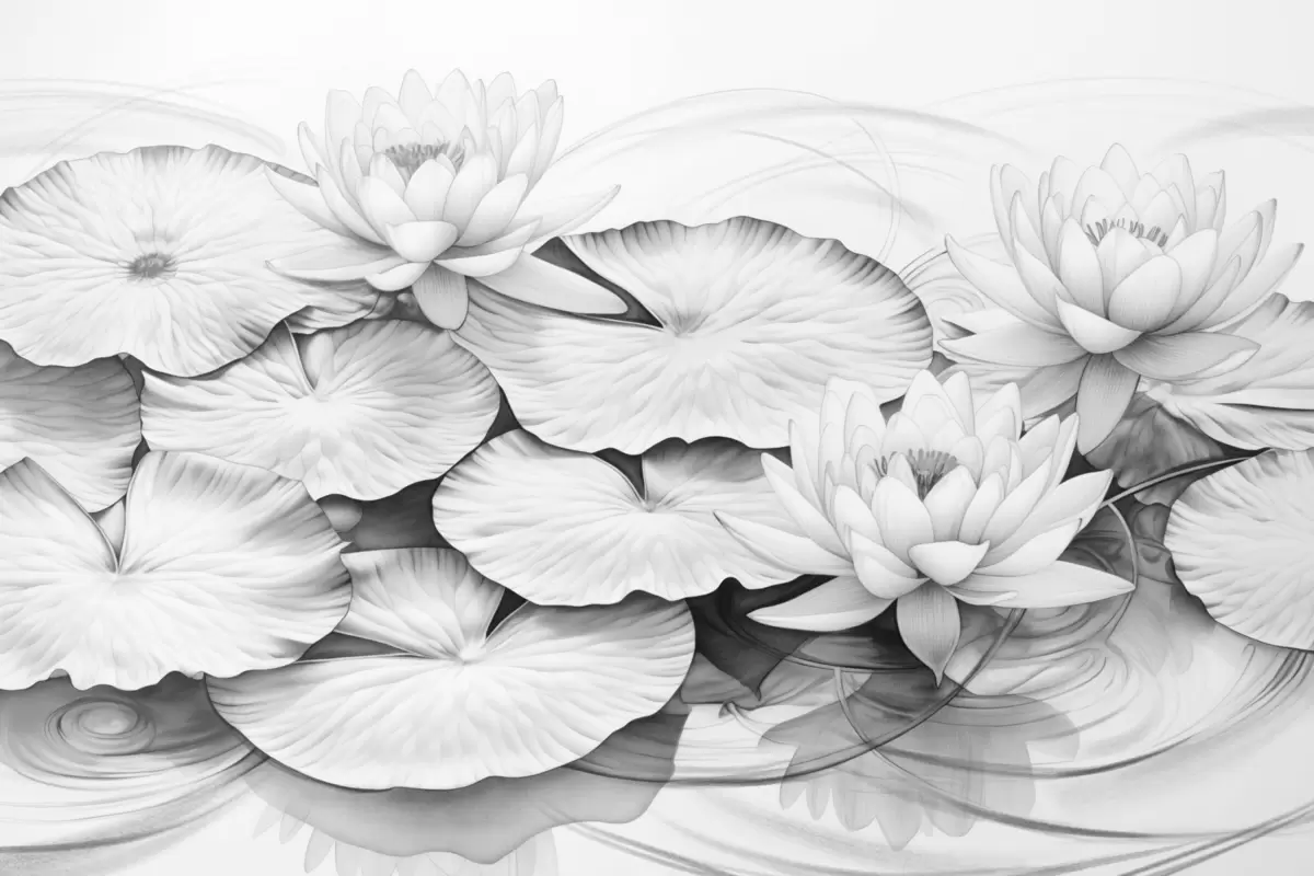 Murais de parede Nenúfares e nenúfares em um lago, imitação em preto e branco de um desenho a lápis, ilustração botânica detalhada, arte da natureza Nr. w09006