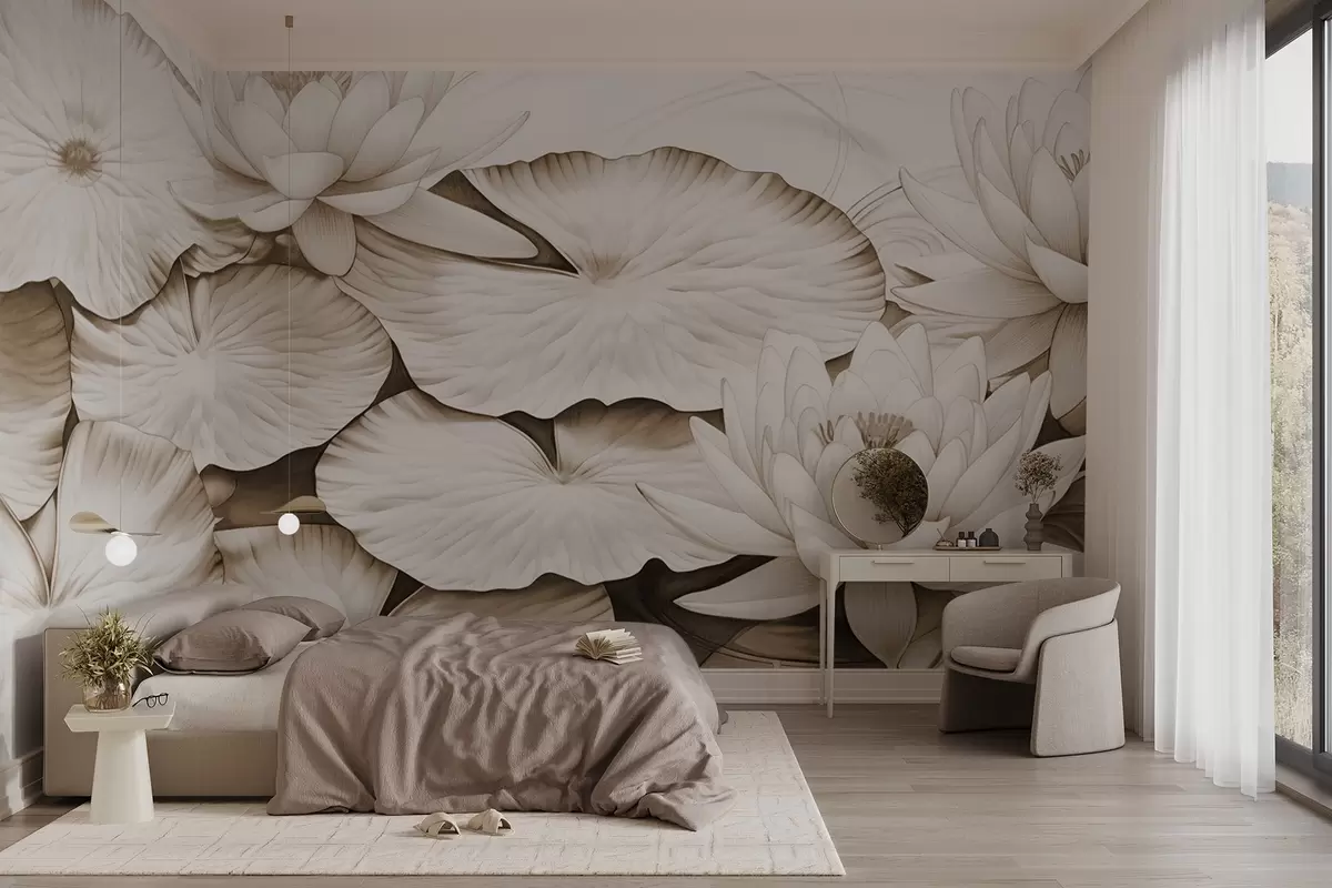 Murais de parede Nenúfares e nenúfares em um lago, imitação em marrom e branco de desenho a lápis, ilustração botânica detalhada, arte da natureza Nr. w09006v2