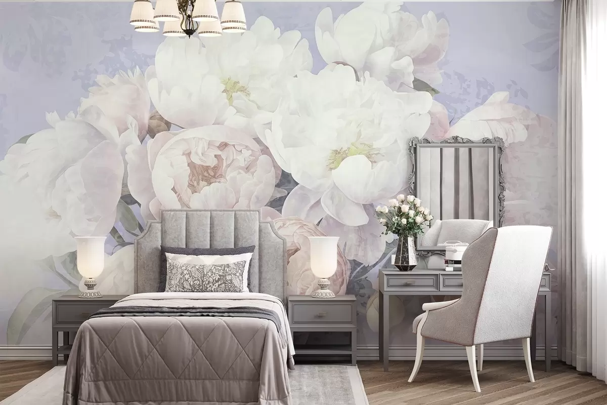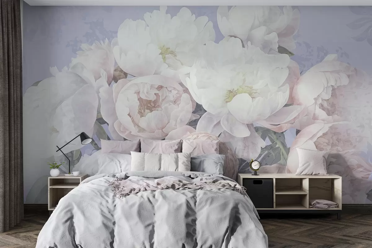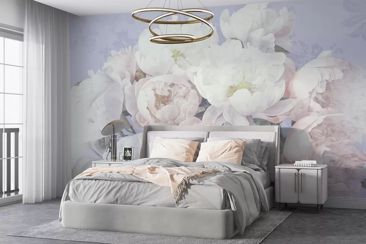 Murais de parede Peônias abstratas texturizadas em pêssego e branco com folhas verdes, fundo claro, cores suaves e delicadas, estilo vintage Nr. w09008v1