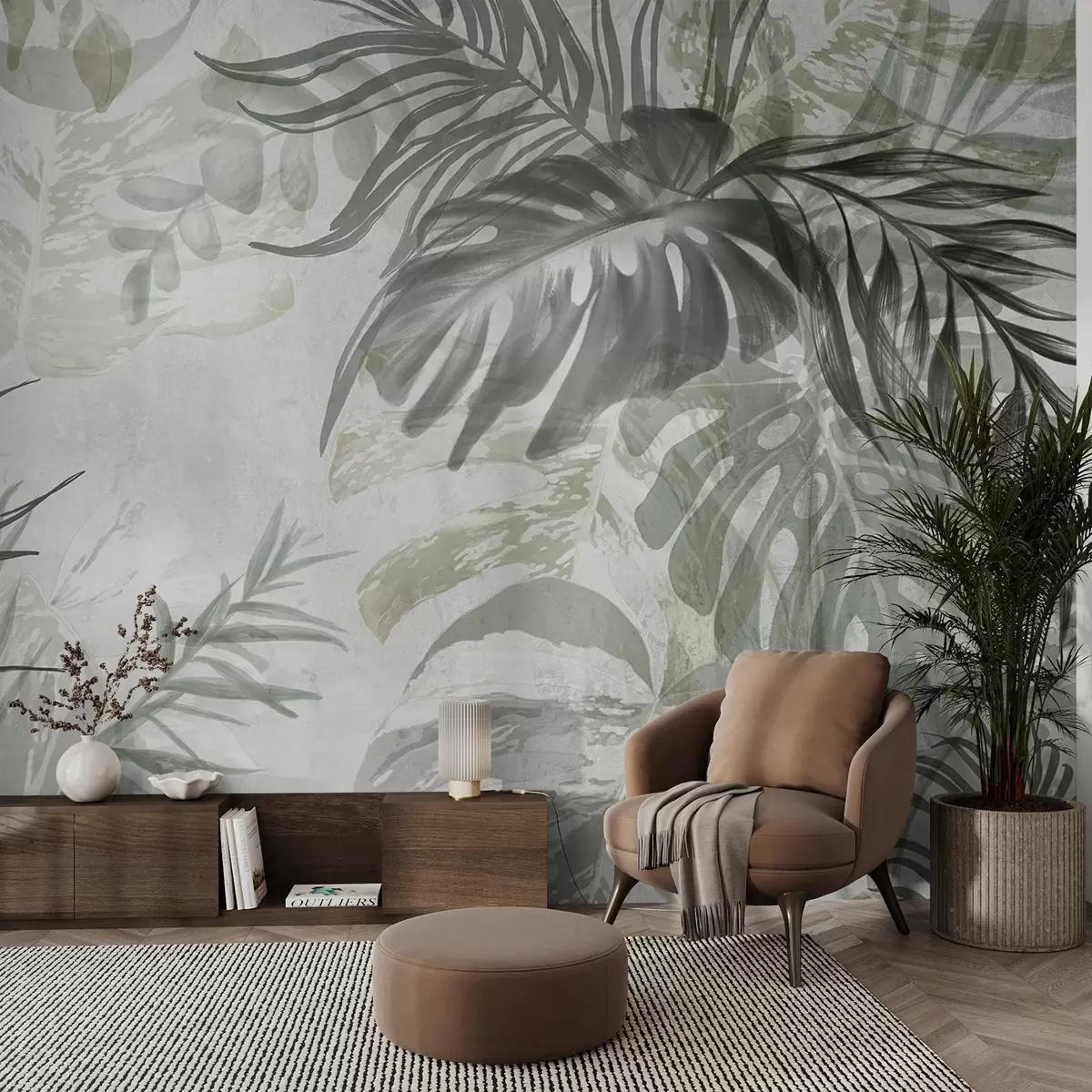 Murais de parede Monstera e folhas de palmeira em tons de verde e cinza, botânica, folhagem tropical, plantas da selva, fundo texturizado Nr. w09011