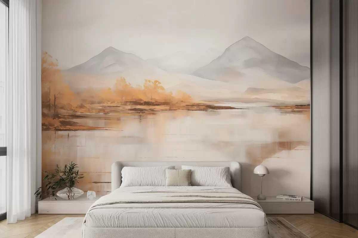 Murais de parede Paisagem de outono com árvores amarelas e um rio em um cenário de montanha Nr. w09020