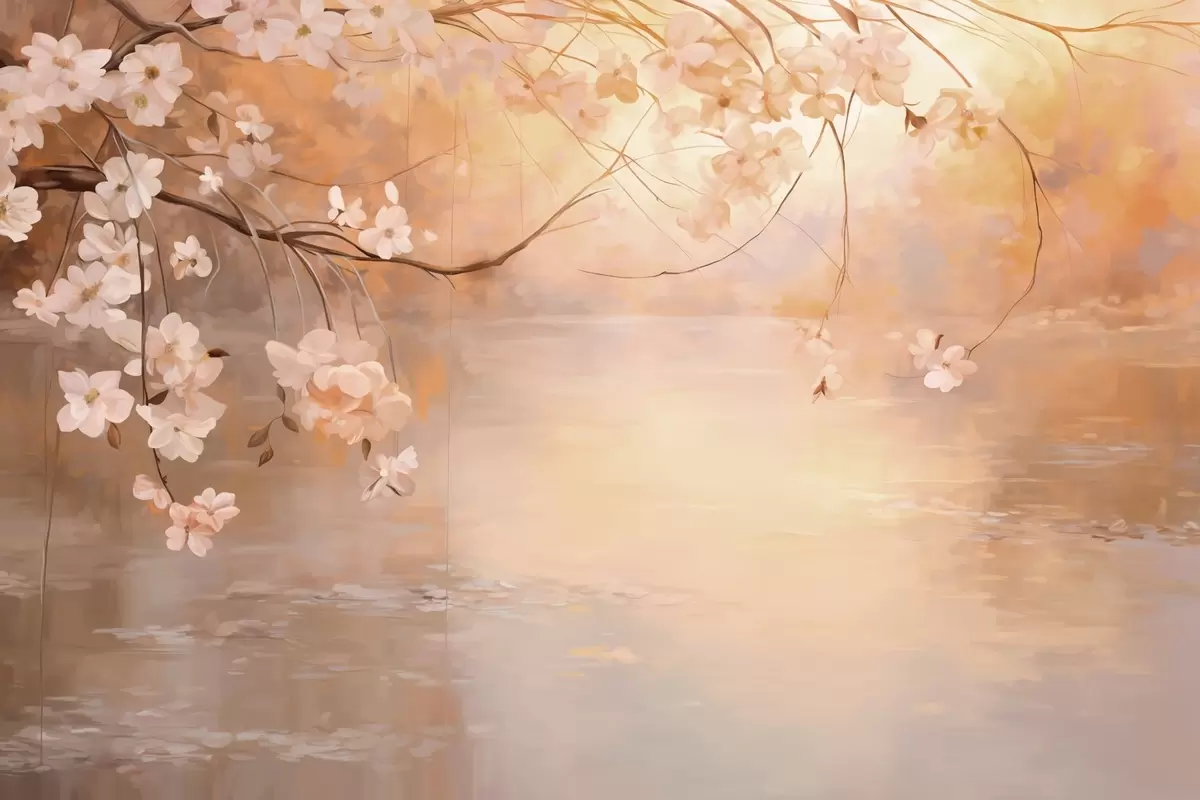Murais de parede Arte abstrata de paisagem com galho de flor e flores brancas penduradas sobre um lago, cores pastéis suaves Nr. w09046