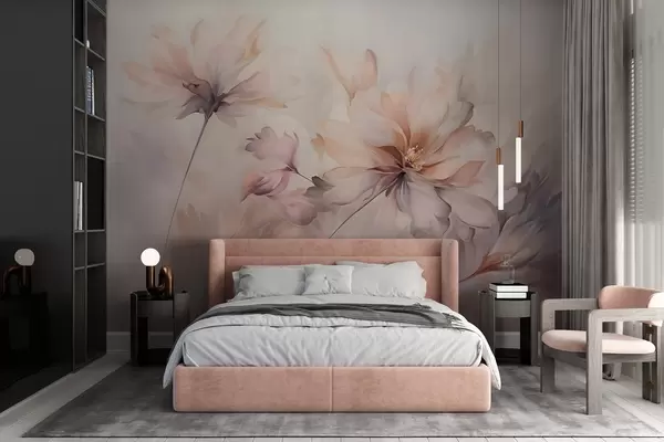 murais de parede Uma delicada arte floral com grandes flores em tons pastéis com pétalas translúcidas, hastes suaves e um fundo suave e difuso  w09050