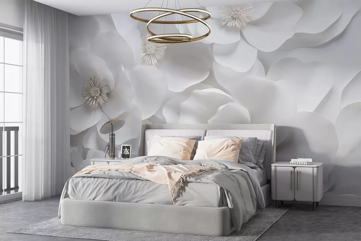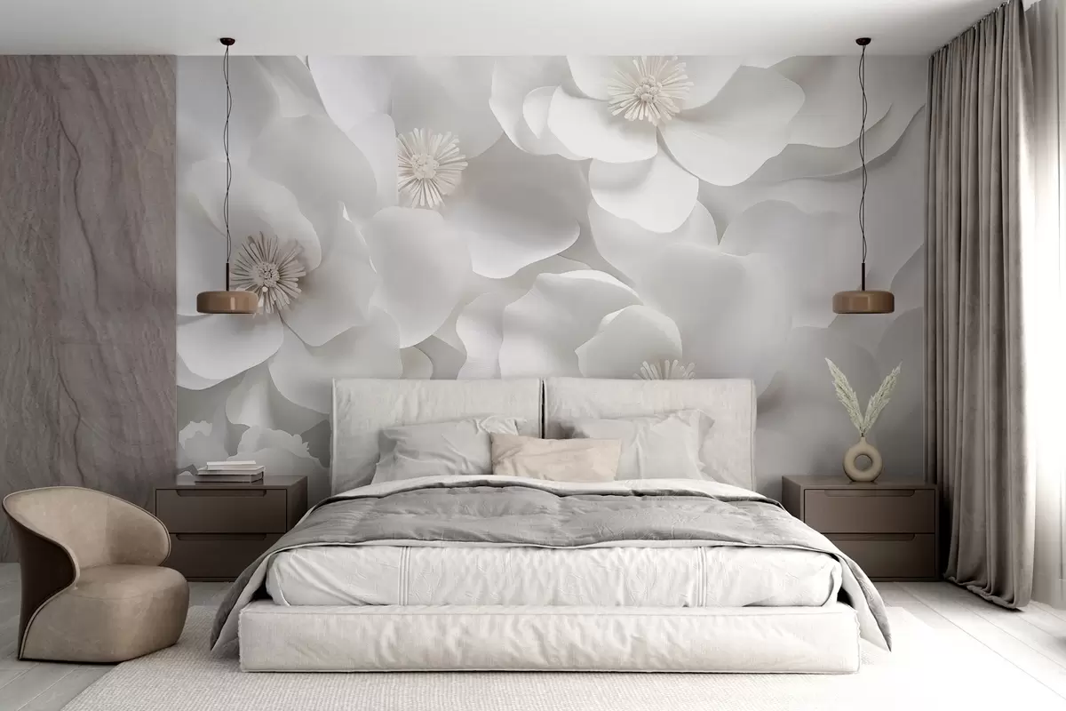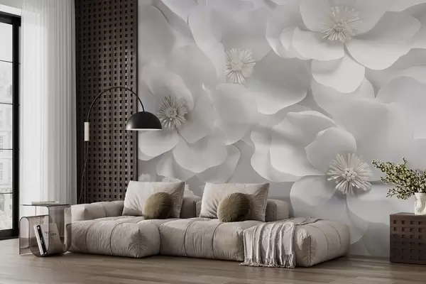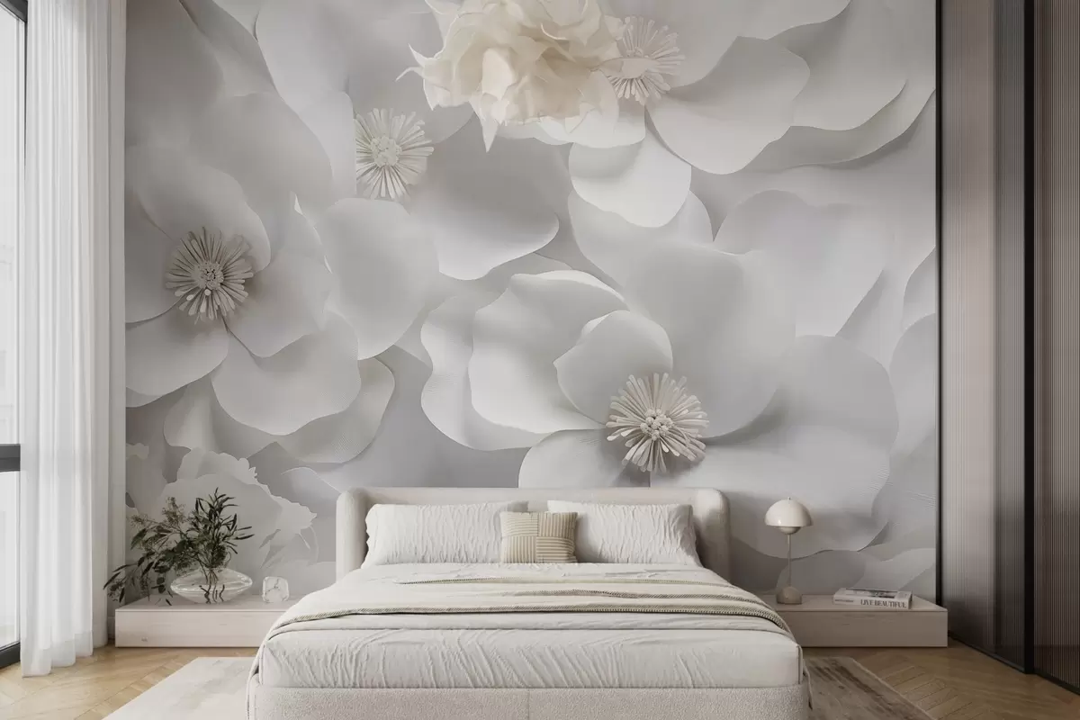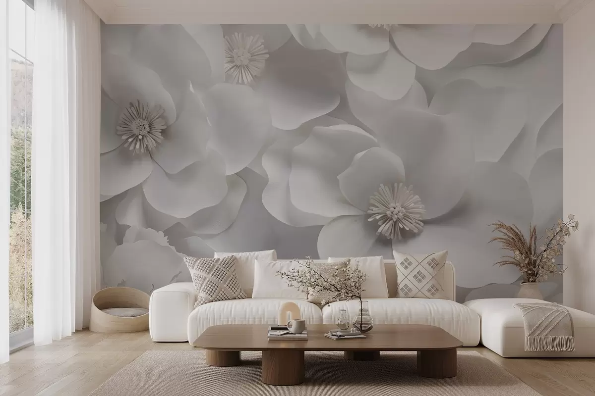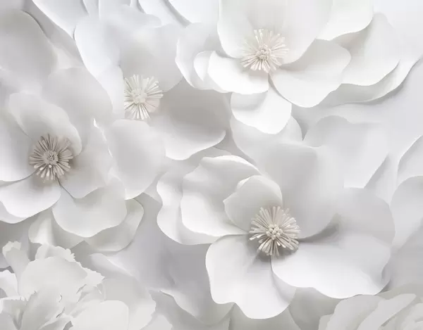 Murais de parede Flores brancas com pétalas delicadas, dispostas em um cacho denso, criando uma sensação de pureza e elegância em um fundo branco Nr. w09053