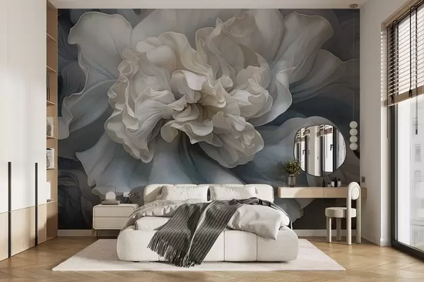 Murais de parede Grande flor decorativa abstrata com muitas pétalas, suave e delicada, com tons de azul e cinza no plano de fundo Nr. w09055