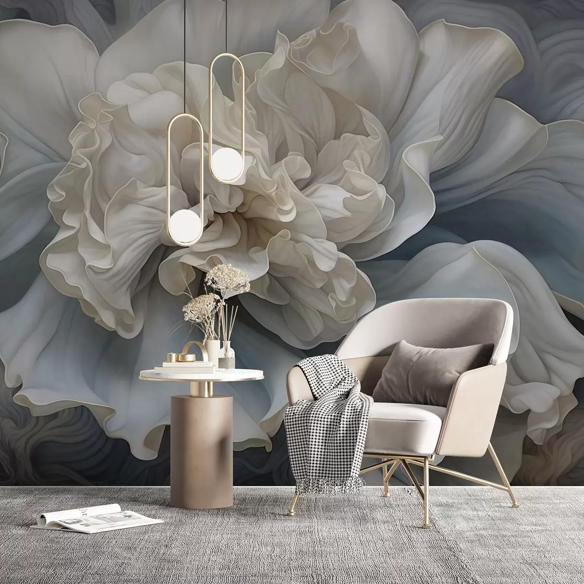 Murais de parede Grande flor decorativa abstrata com muitas pétalas, suave e delicada, com tons de azul e cinza no plano de fundo Nr. w09055
