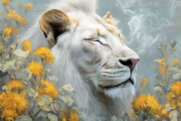 Murais de parede Um leão branco cercado por flores amarelas e fumaça Nr. w09080