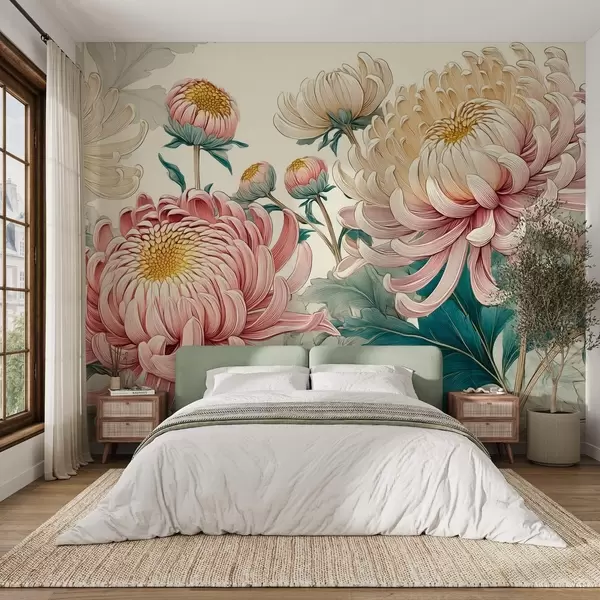 Murais de parede Pintura intrincada de crisântemos brancos e rosa Nr. w09081