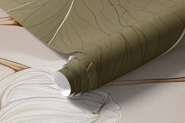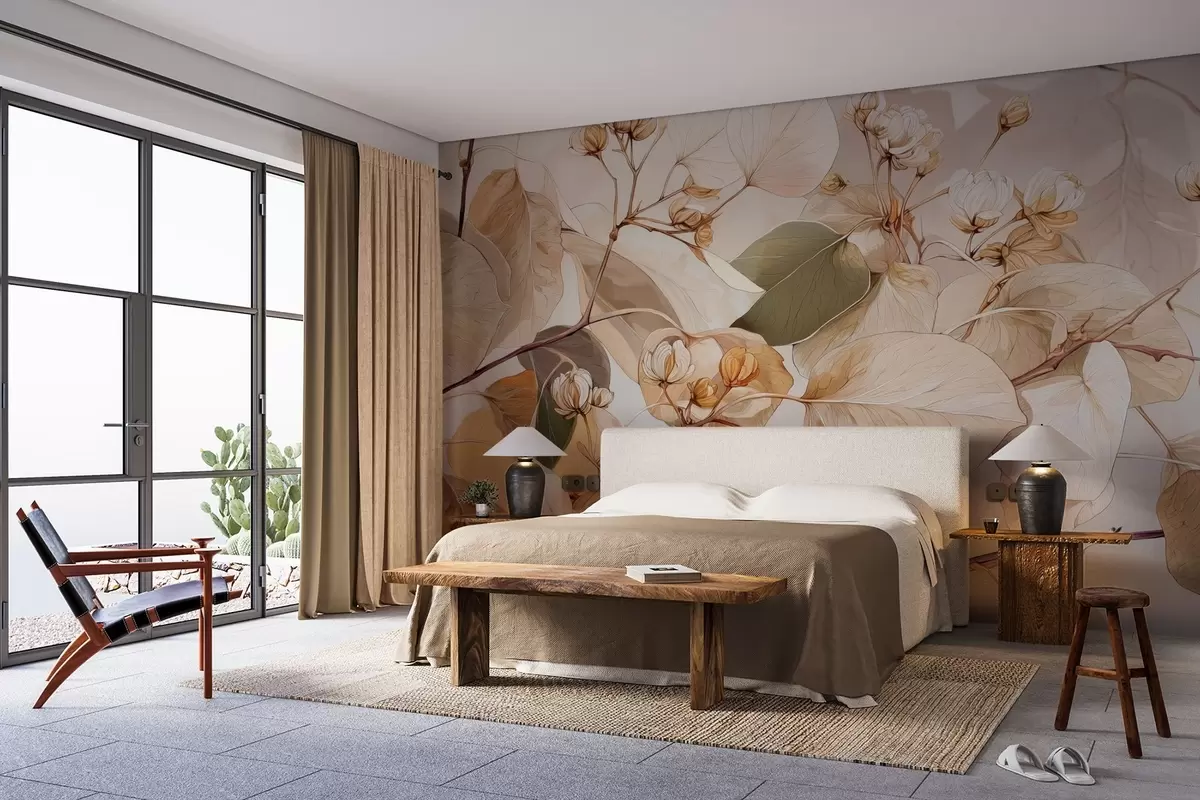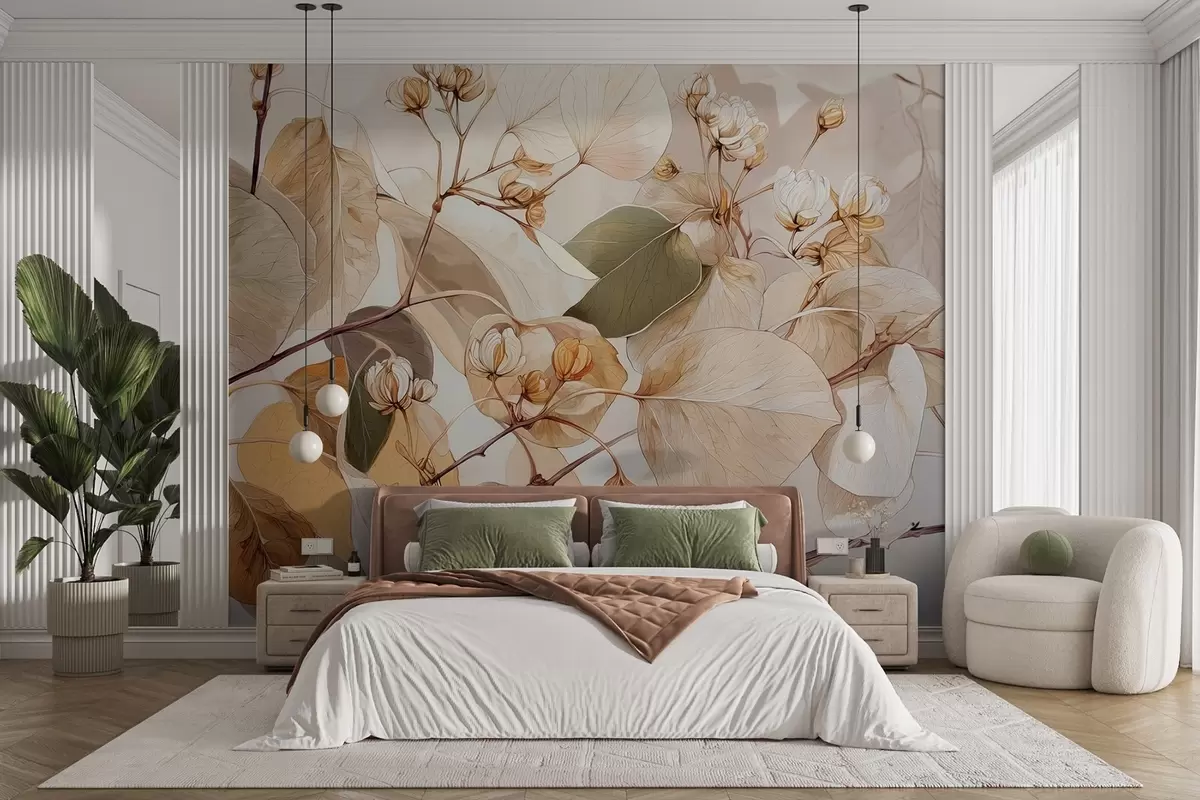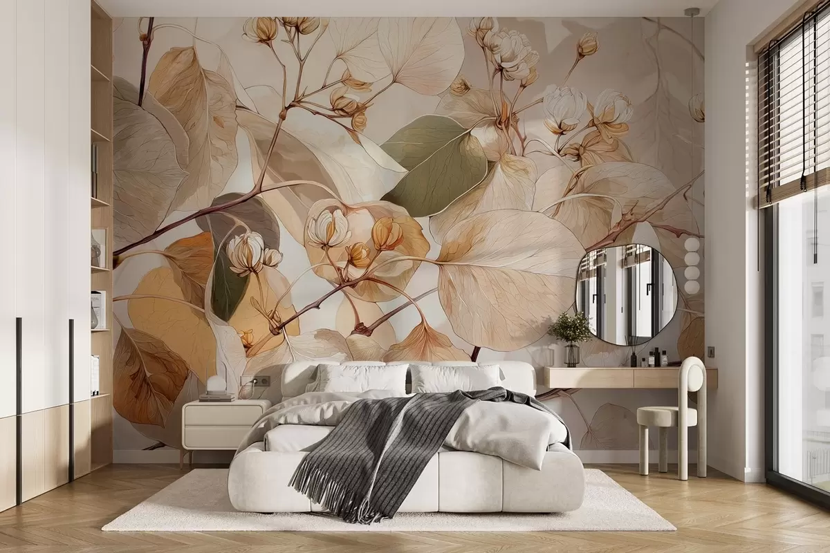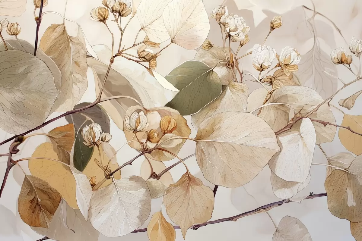 Murais de parede Ramos de folhas e flores de álamo tremedor em estilo de pintura a óleo em tons de bege Nr. w09082
