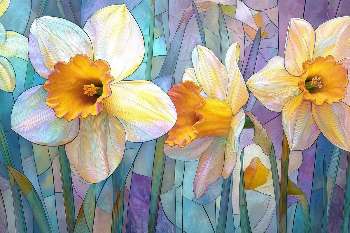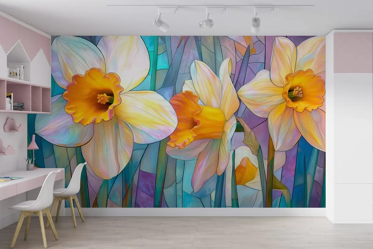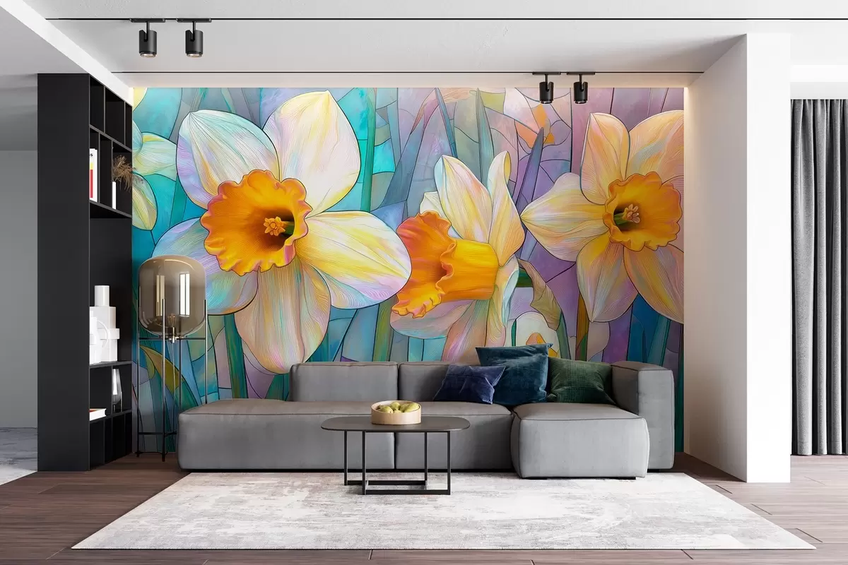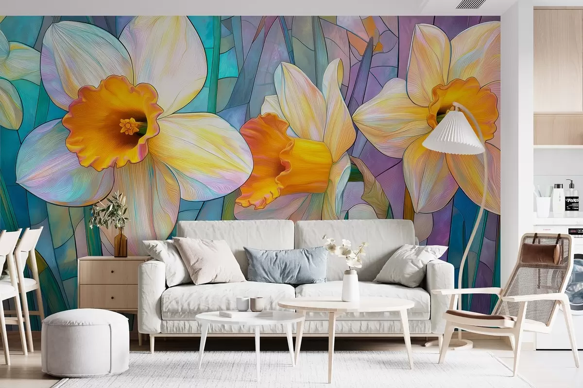 Murais de parede Narcisos coloridos em um fundo de vidro colorido azul-violeta Nr. w09092