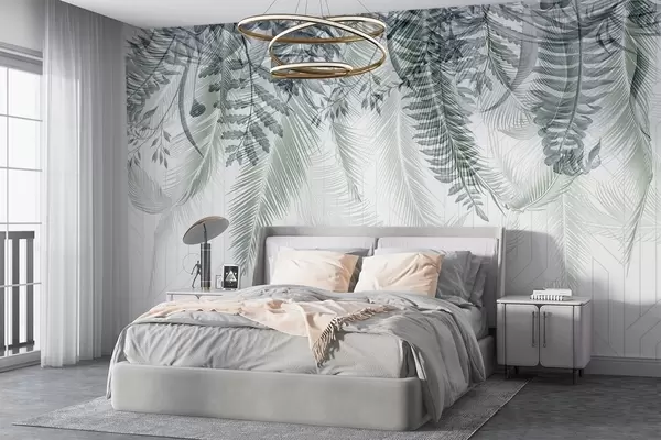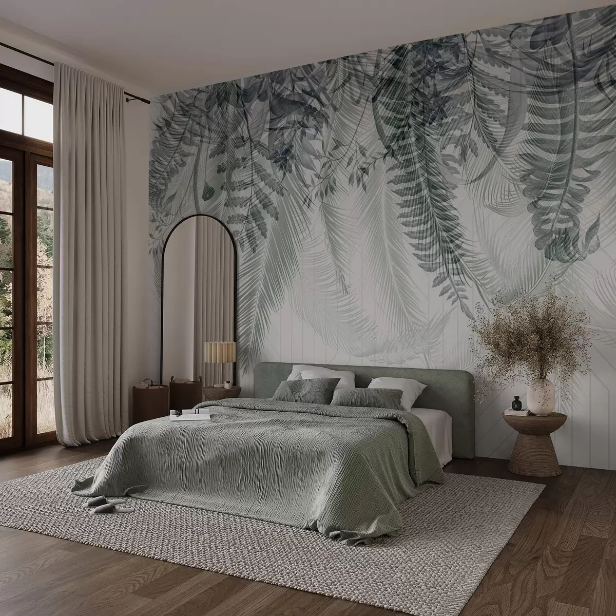 Murais de parede Delicada queda de samambaia tropical e folhas de palmeira, fundo geométrico, luz suave, cores suaves, elegante Nr. w09106