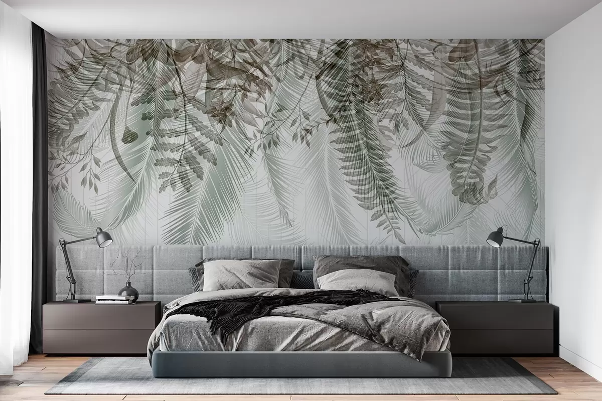 Murais de parede Delicada queda de samambaia tropical e folhas de palmeira, fundo geométrico, luz suave, cores suaves, elegante Nr. w09106v1