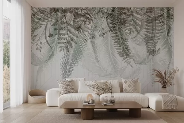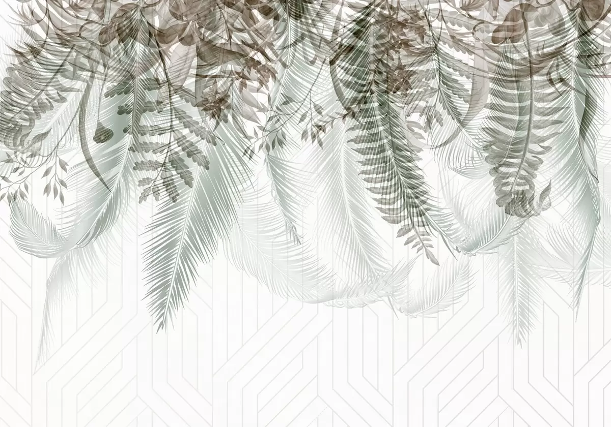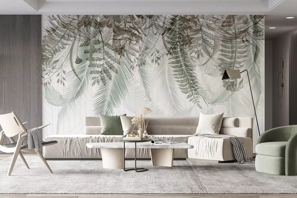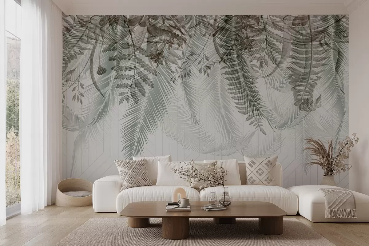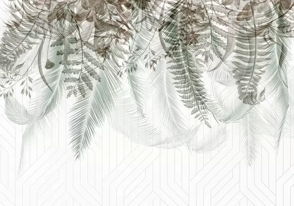 murais de parede Delicada queda de samambaia tropical e folhas de palmeira, fundo geométrico, luz suave, cores suaves, elegante w09106v1