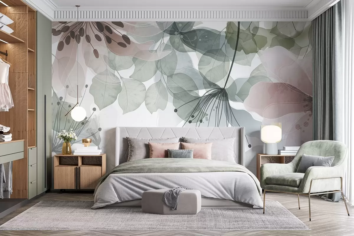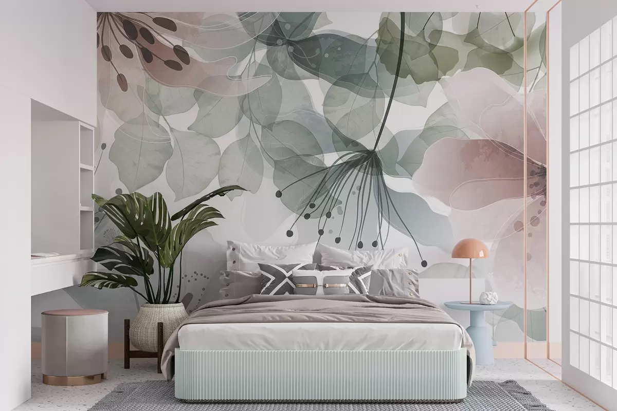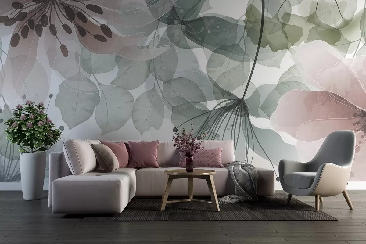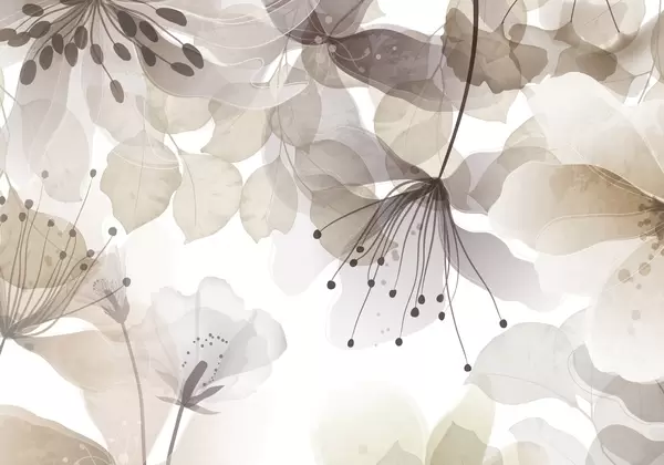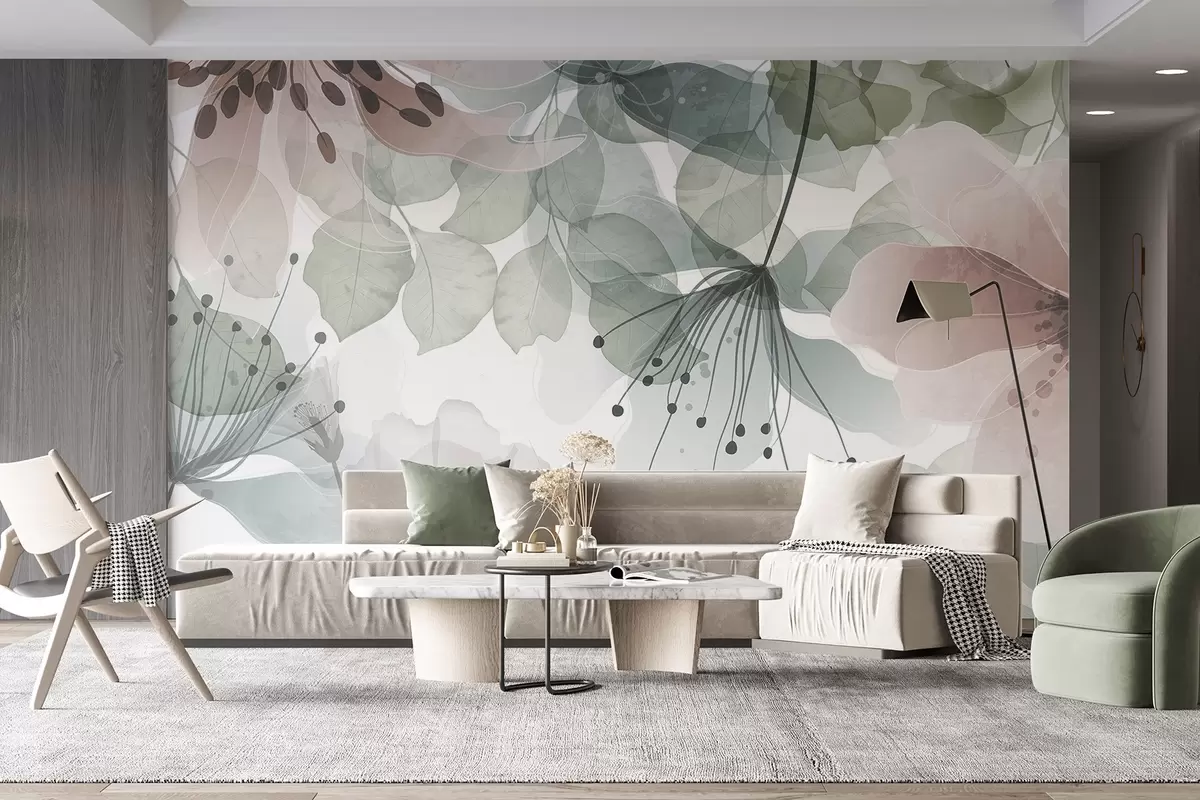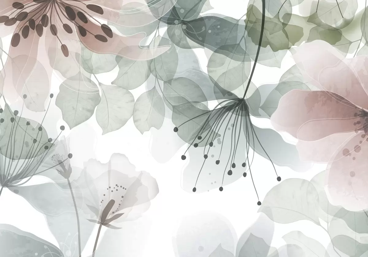 Murais de parede Flores e folhas em tons pastéis, pétalas e folhas translúcidas, efeito de aquarela suave, linhas delicadas, fundo branco Nr. w09107