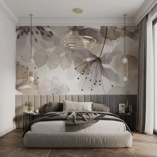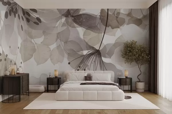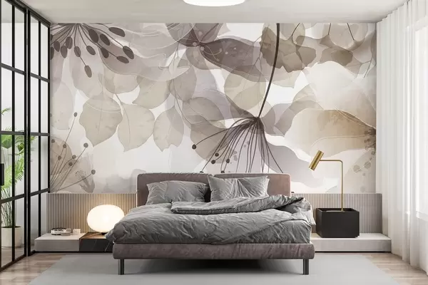 Murais de parede Flores e folhas em tons de bege, pétalas e folhas translúcidas, efeito de aquarela suave, linhas delicadas, fundo branco Nr. w09107v1