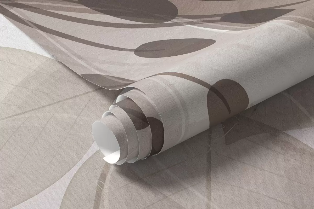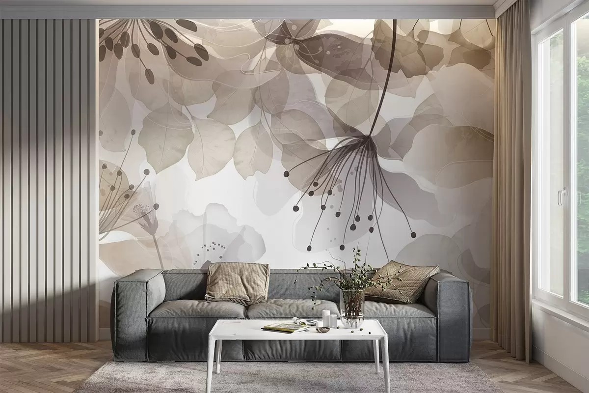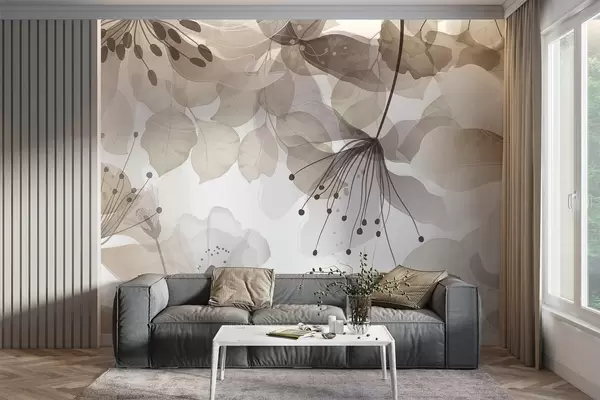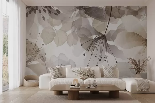 Murais de parede Flores e folhas em tons de bege, pétalas e folhas translúcidas, efeito de aquarela suave, linhas delicadas, fundo branco Nr. w09107v1
