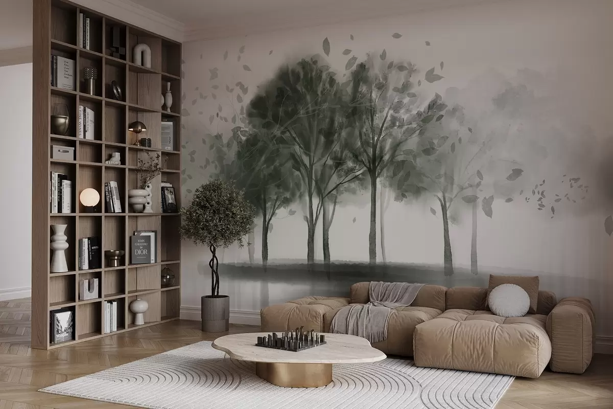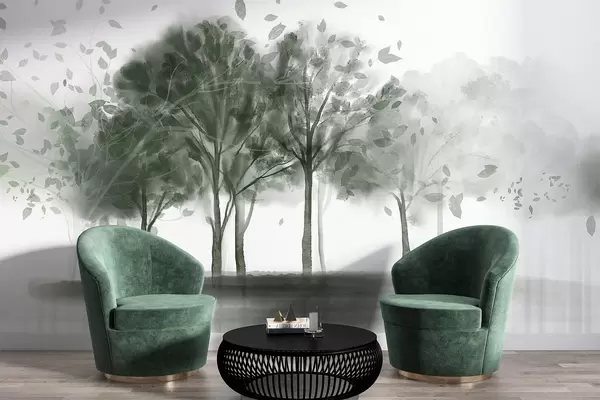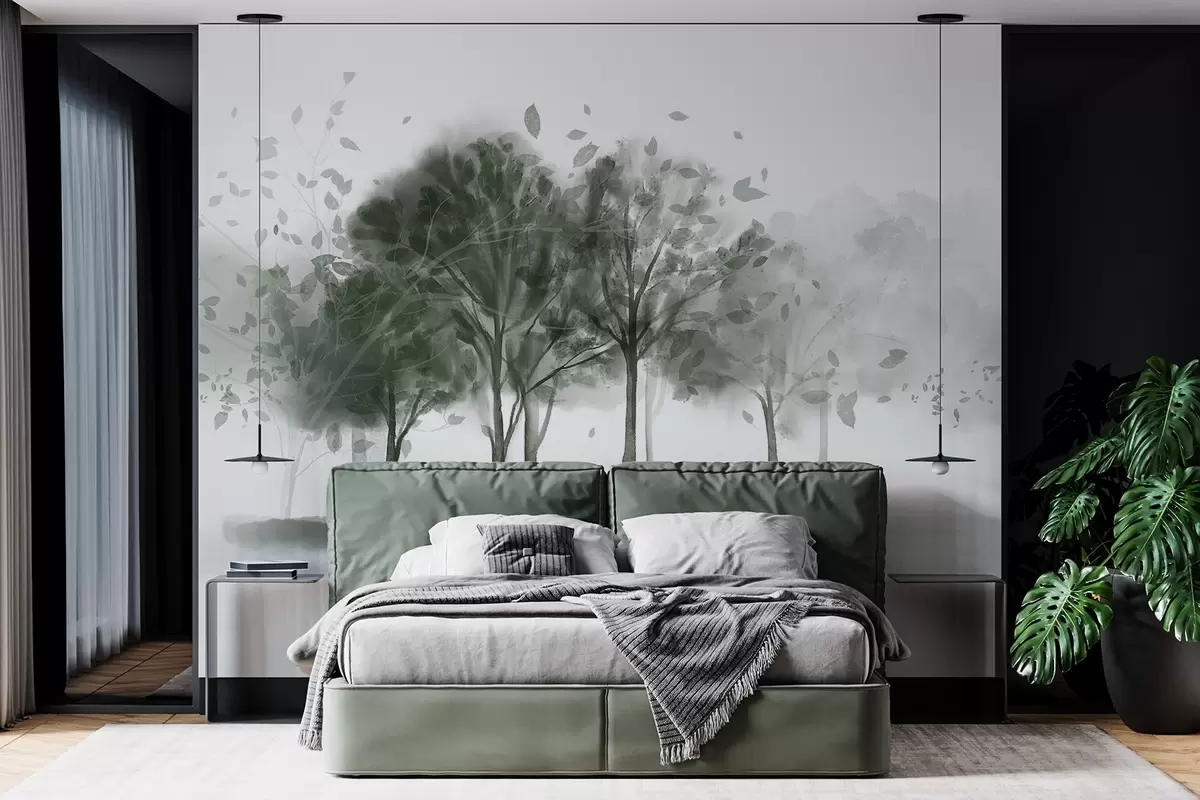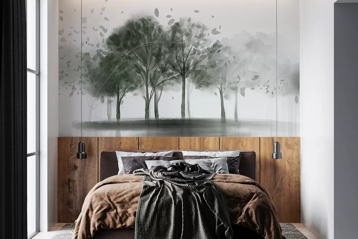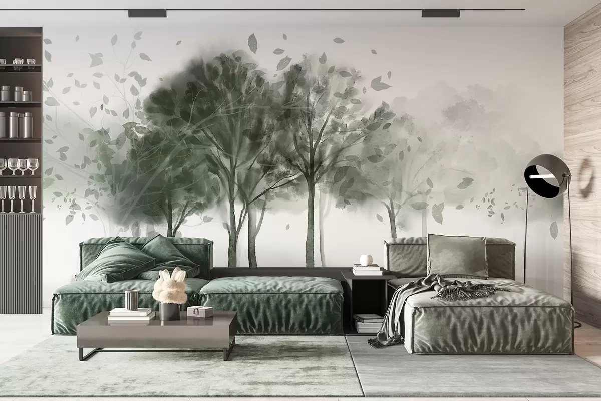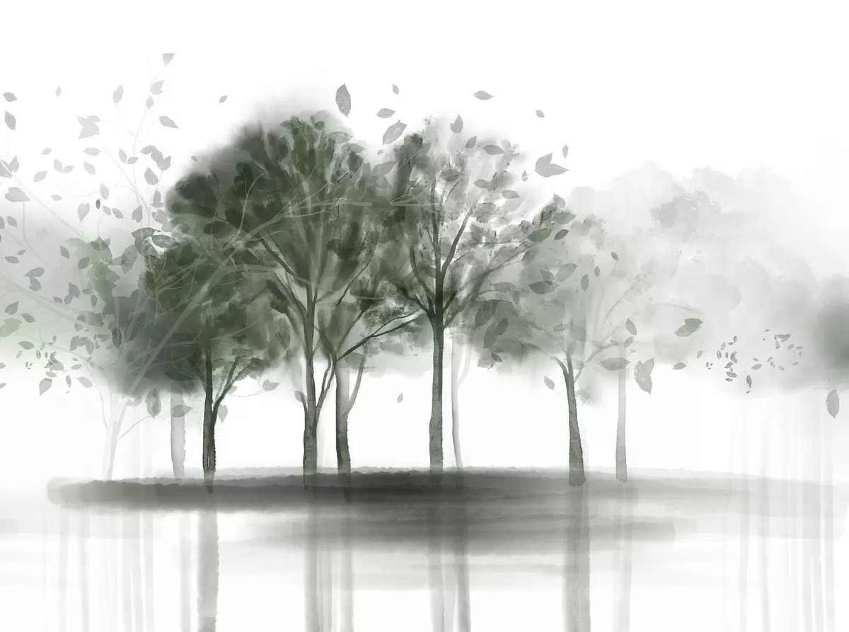 Murais de parede Paisagem abstrata com árvores com folhas verdes refletindo na água, em estilo aquarela texturizado Nr. w09109