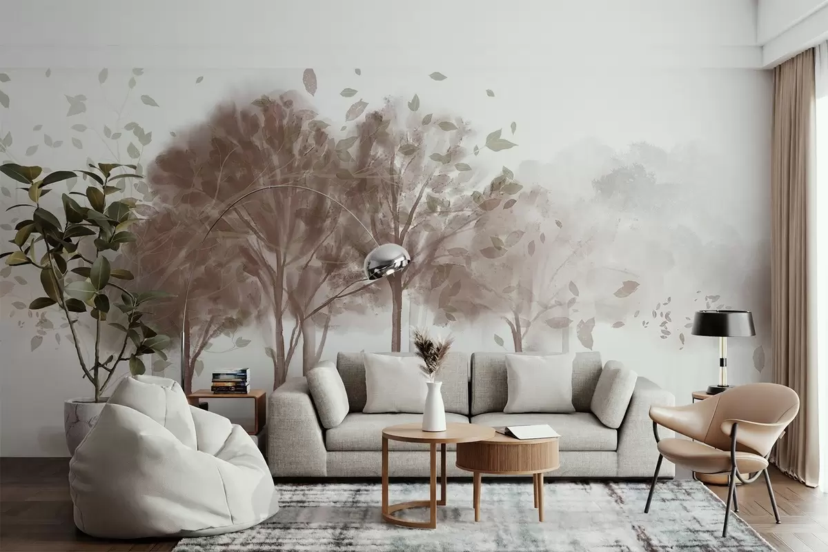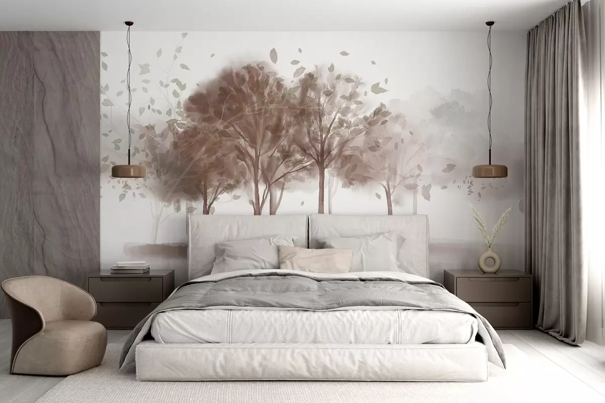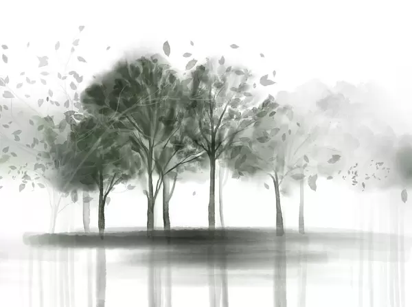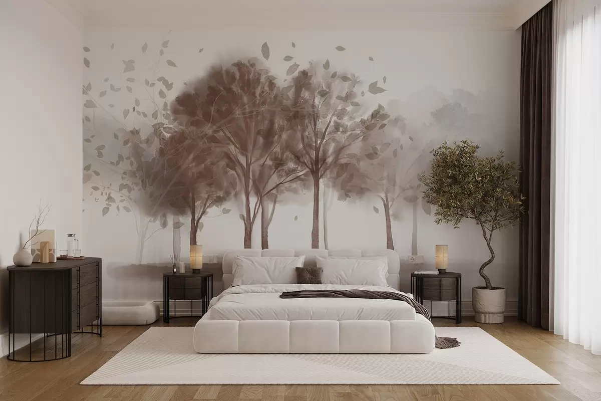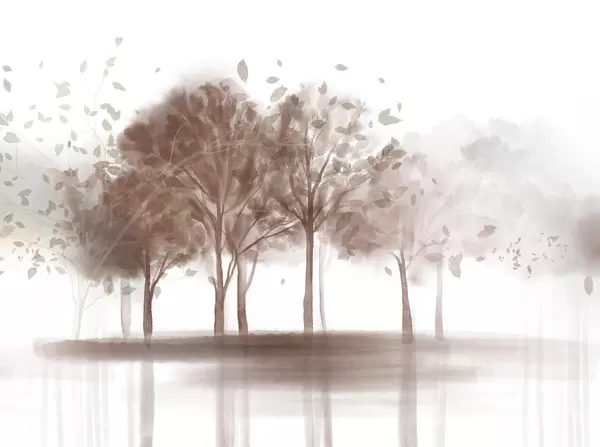 Murais de parede Paisagem abstrata com árvores com folhas marrons refletindo na água, em estilo aquarela texturizado Nr. w09109v1