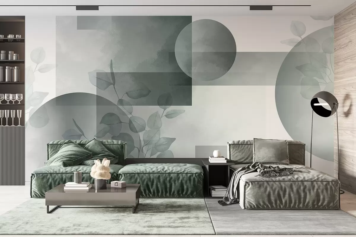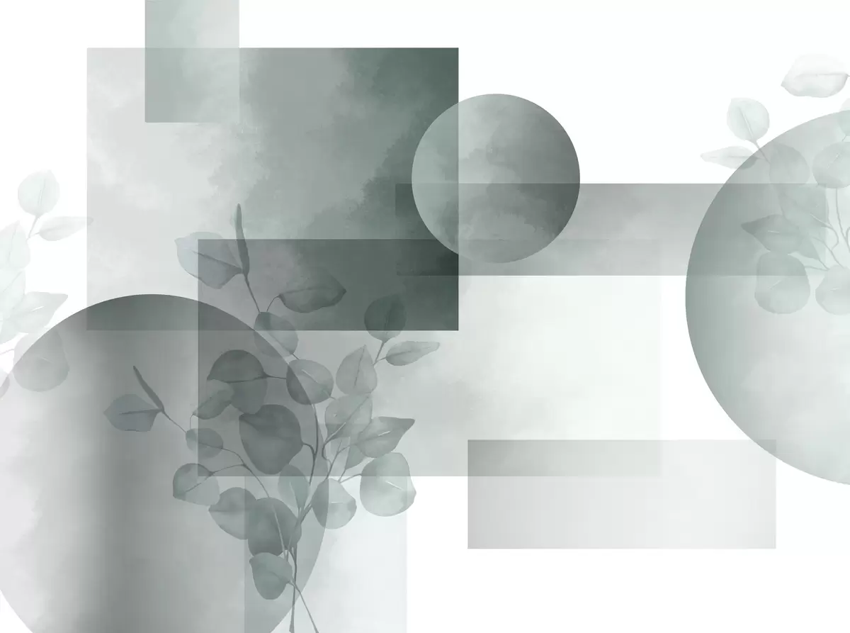 Murais de parede Desenho geométrico minimalista moderno abstrato com círculos e retângulos, folhas de eucalipto, efeito de aquarela Nr. w09110